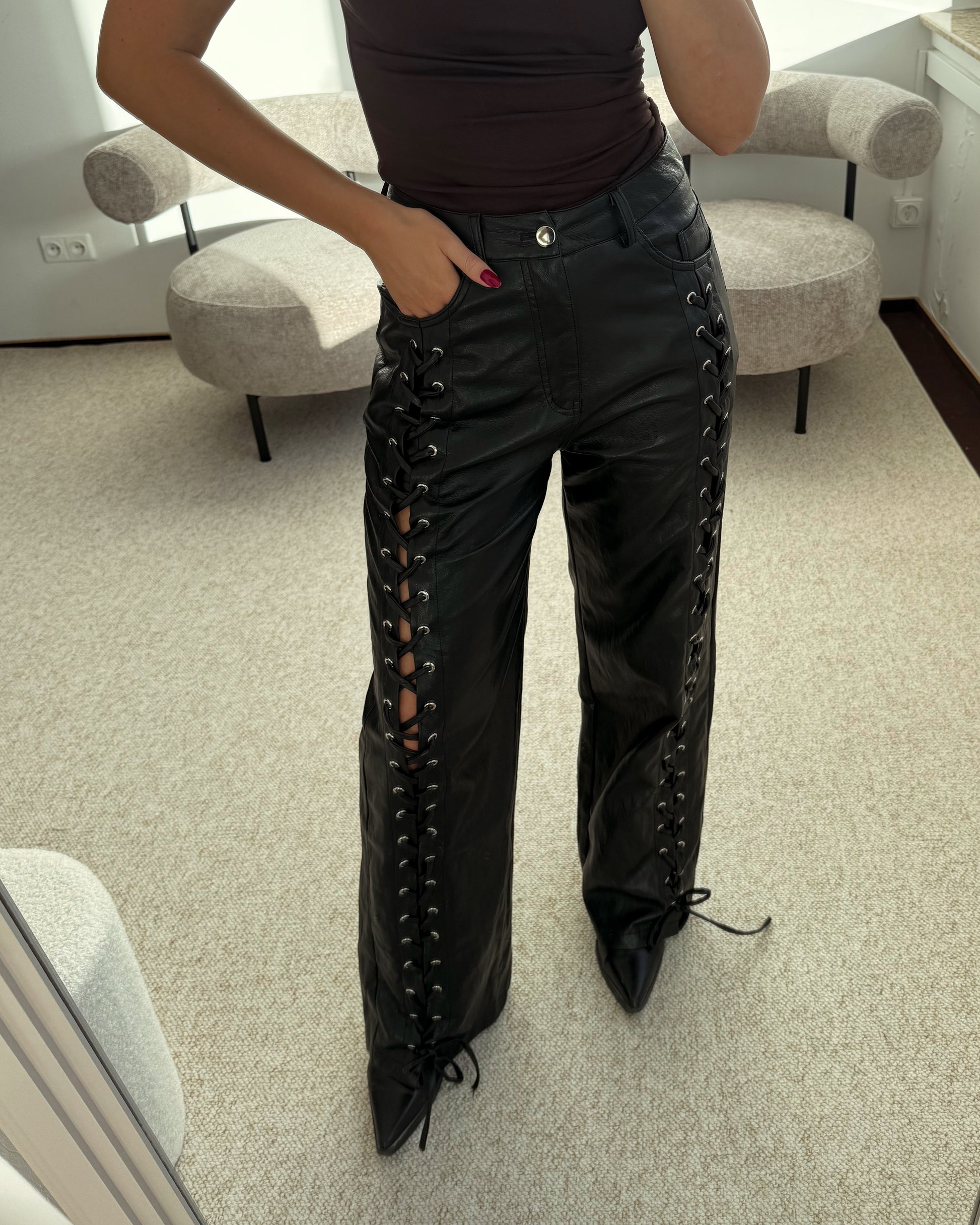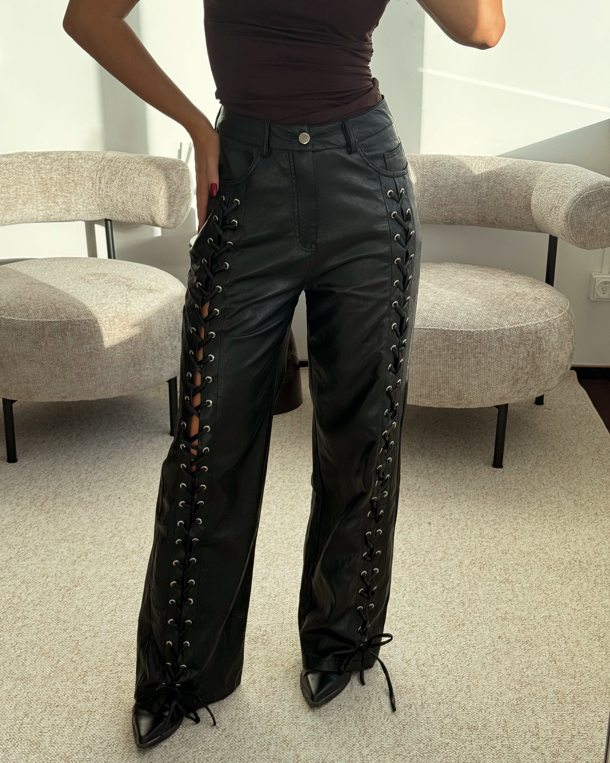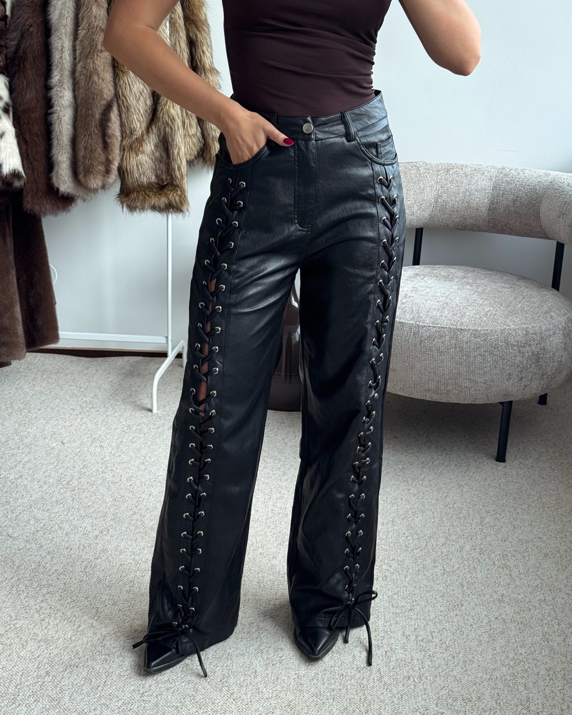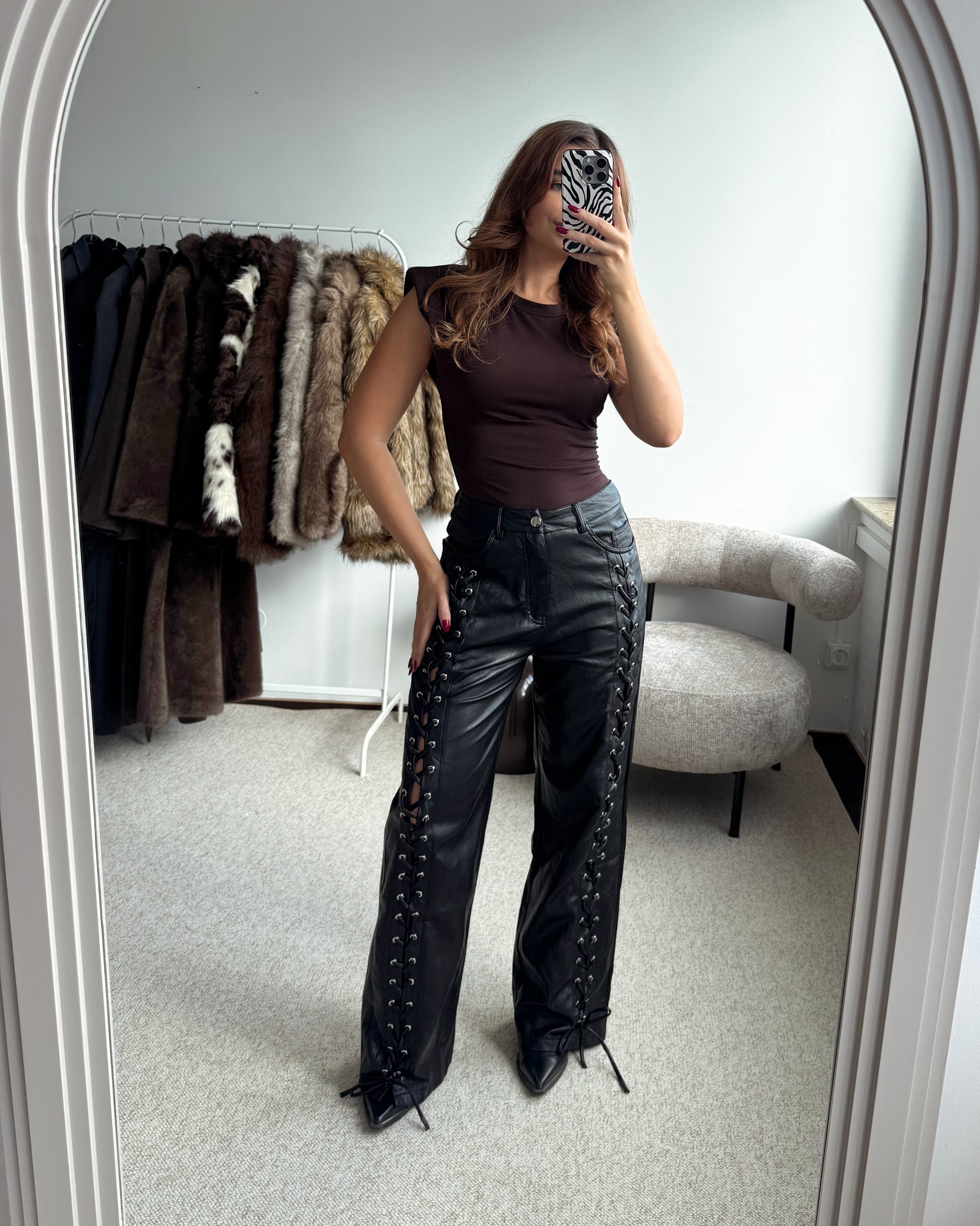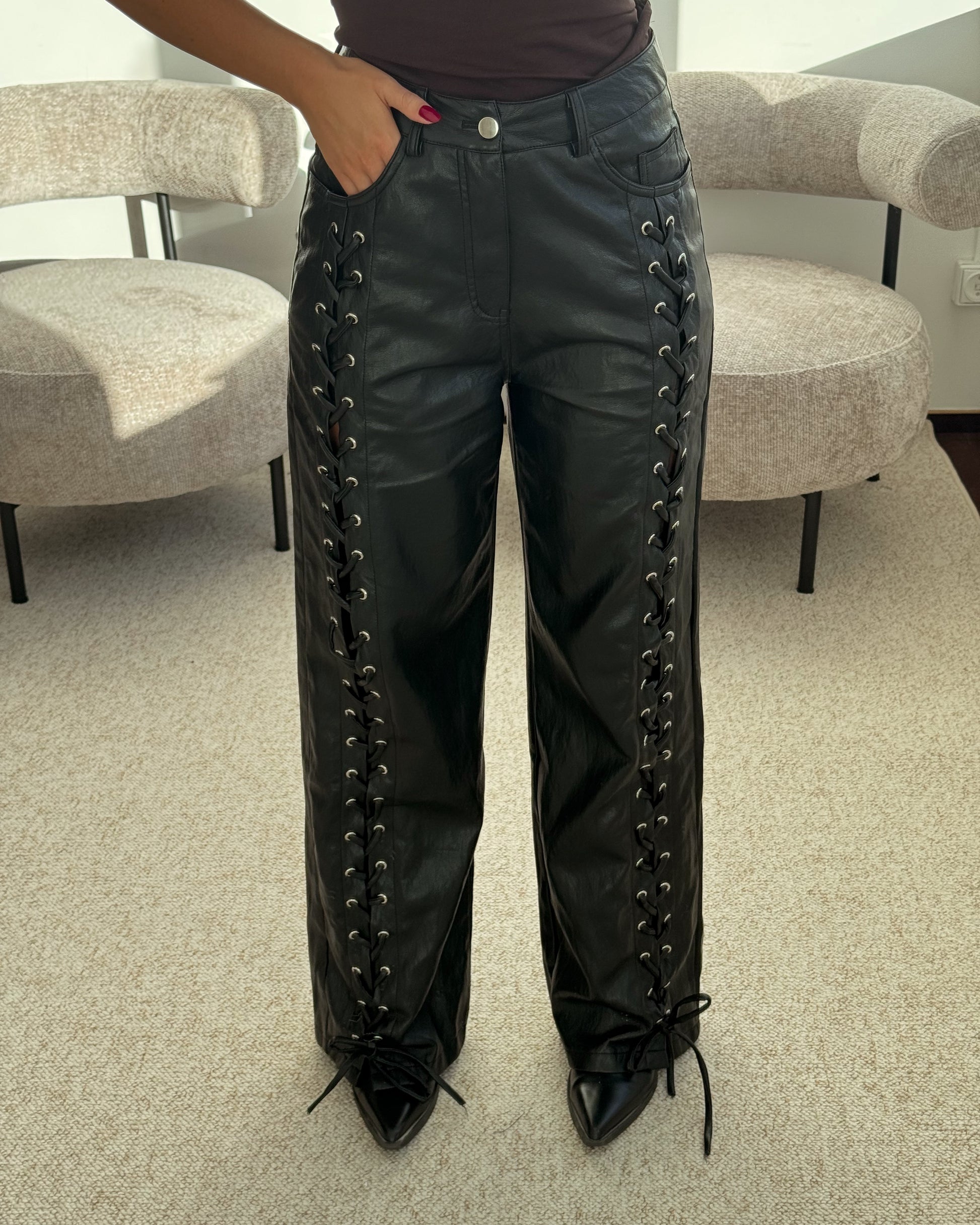 Pagamintos iš kokybiškos eko odos mišinio, jos išlaiko formą ir pasižymi lengvu blizgesiu. Raištelius šonuose galima sureguliuoti - palikti juos labiau suveržtus arba praplatinti, kad subtiliai matytųsi oda. Klasikinis užsegimas su sagute ir užtrauktuku, aukštas liemuo bei pailgintas modelis vizualiai ilgina siluetą.