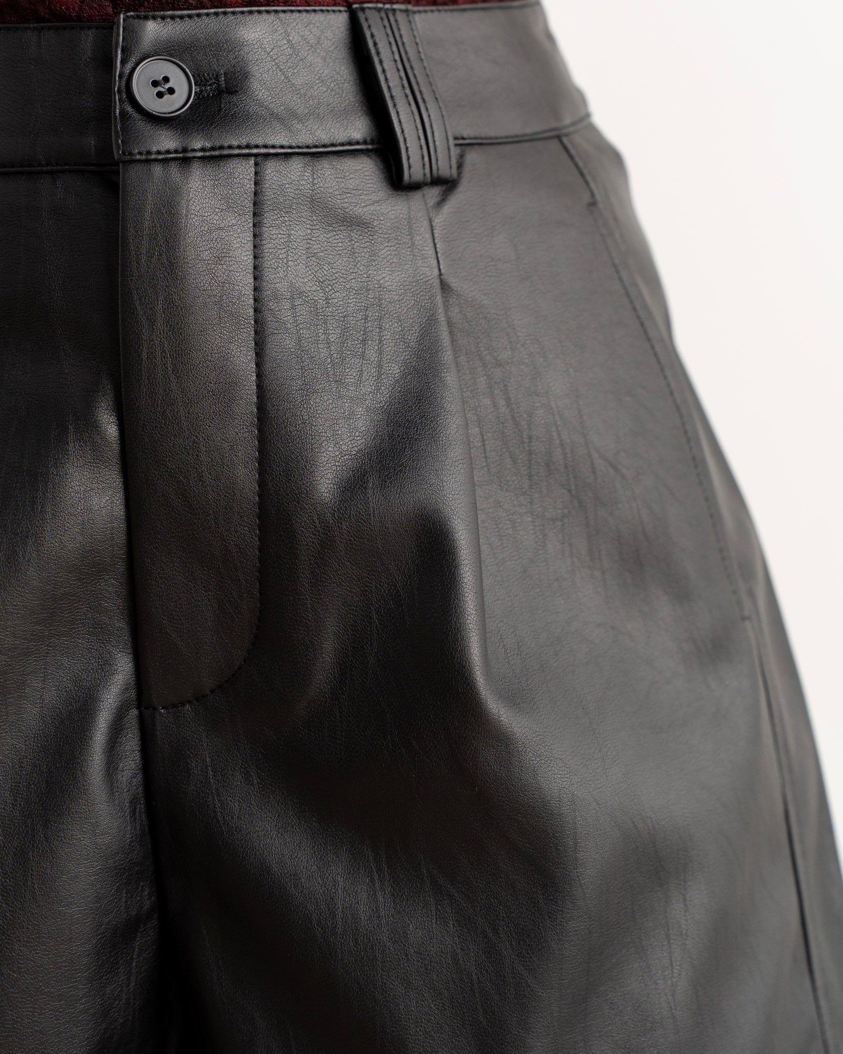Klasikinio silueto šortai, pasiūti iš minkštos, kokybiškos eko odos. Aukštas liemuo, klasikinis užsegimas su sagute ir užtrauktuku bei šoninės kišenės. Švelnus vidinis pamušalas neleidžia odai „lipti“ prie kūno.
