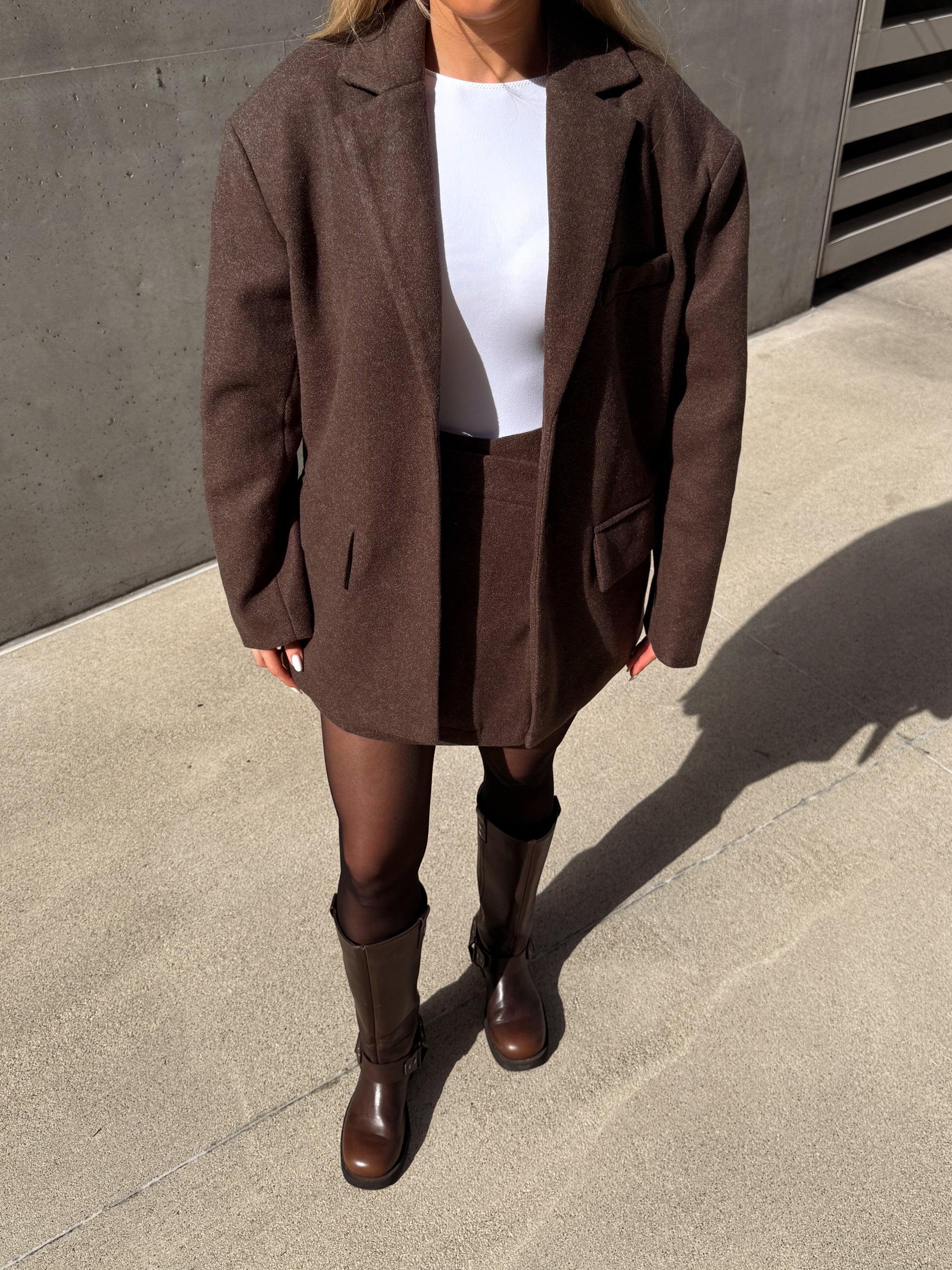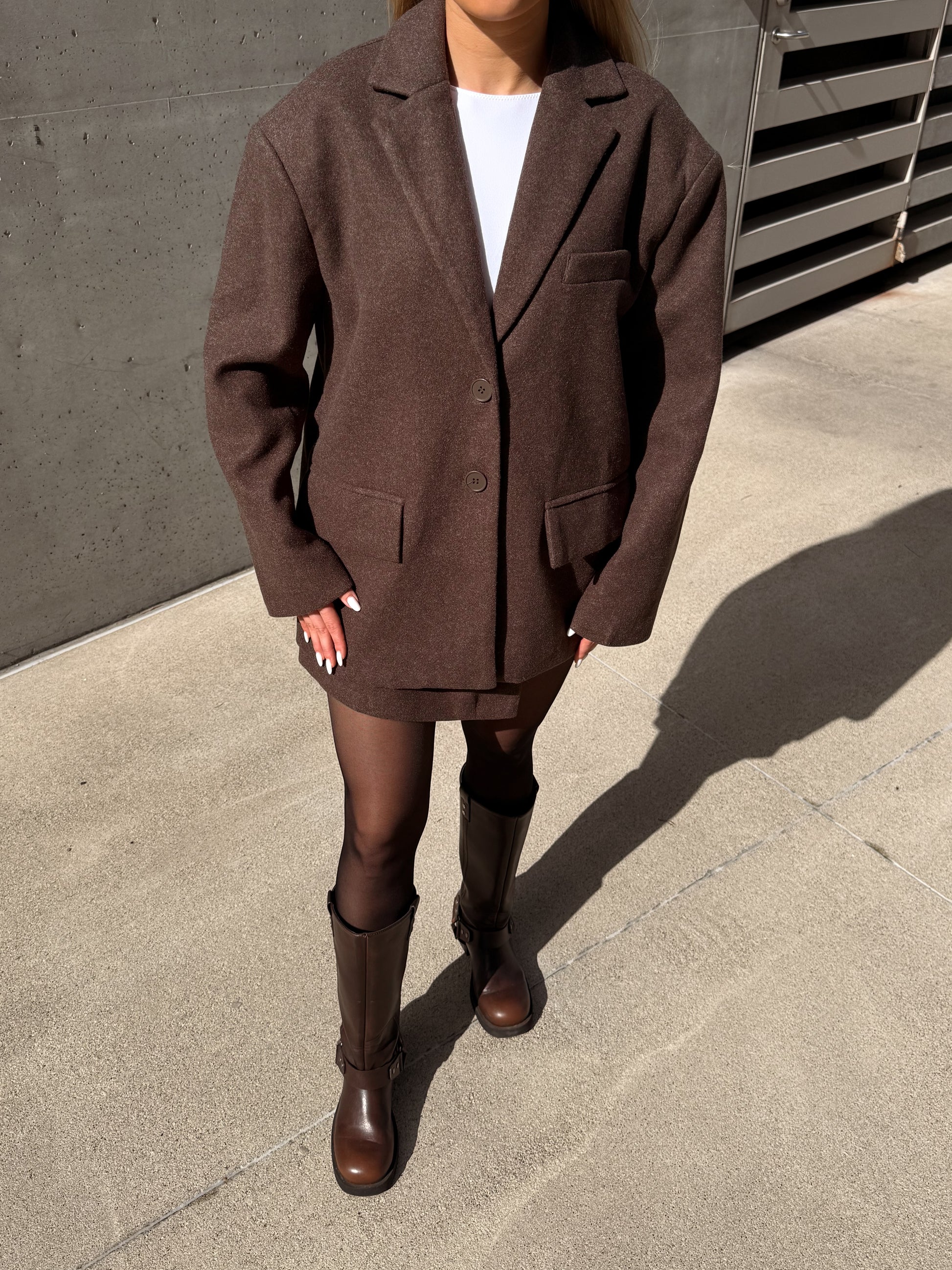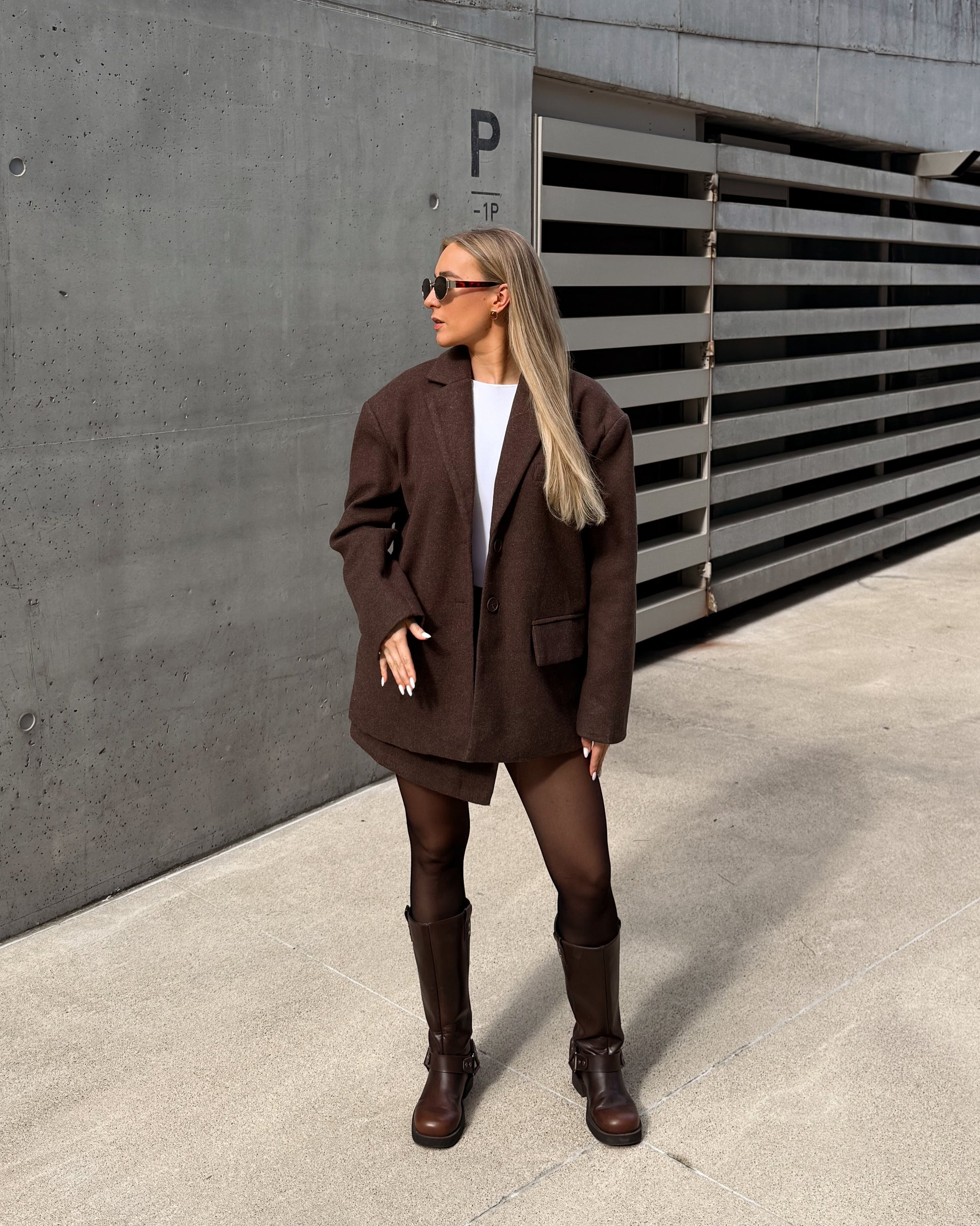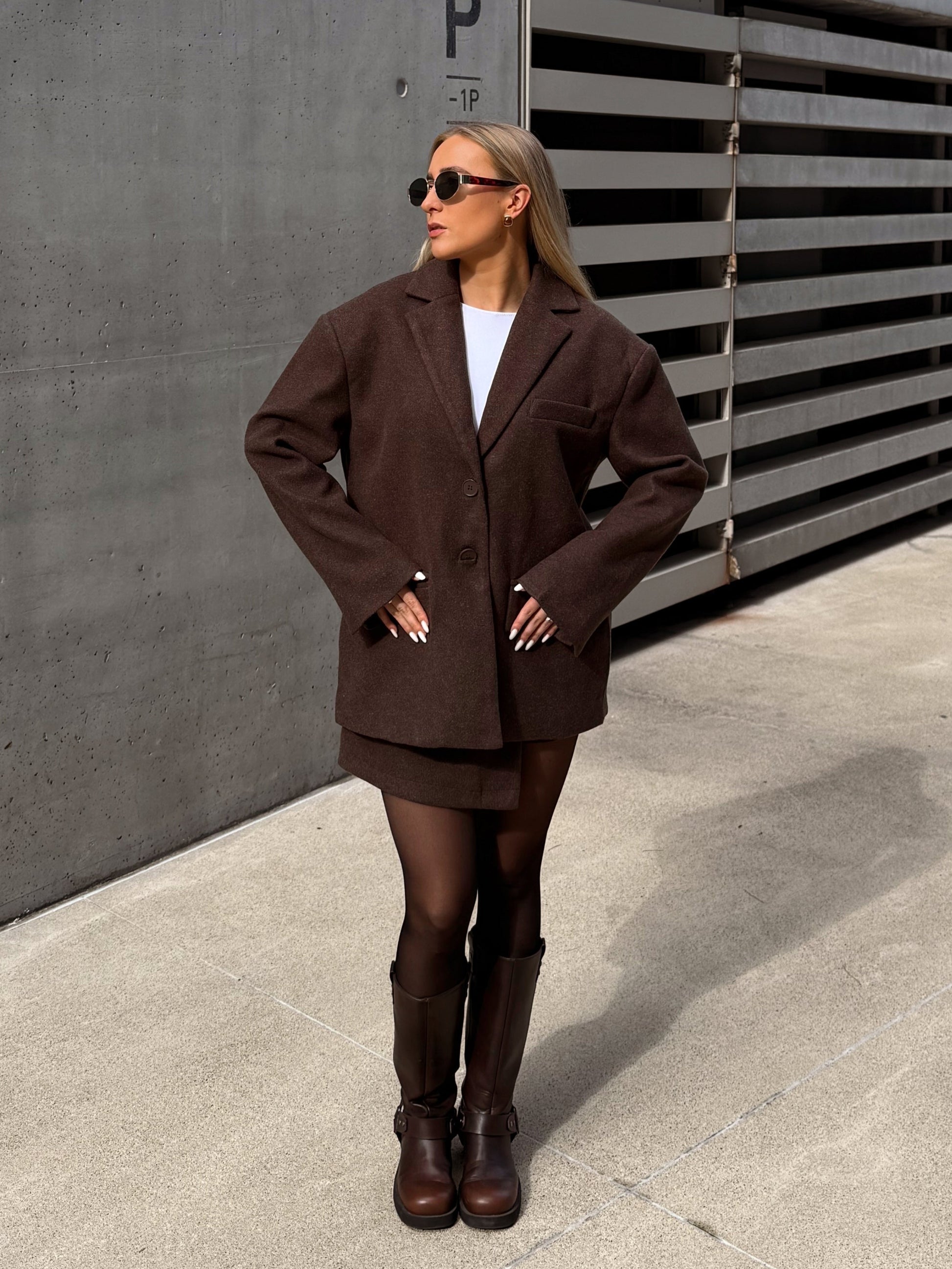 Stilingas dviejų dalių komplektas: oversized tipo švarkas ir sijonšorčiai. Kostiumėlis pasiūtas iš tvirto, kokybiško audinio, kuris išlaiko formą ir atrodo elegantiškai. Puikus pasirinkimas tiek kasdienai, tiek ypatingoms progoms.