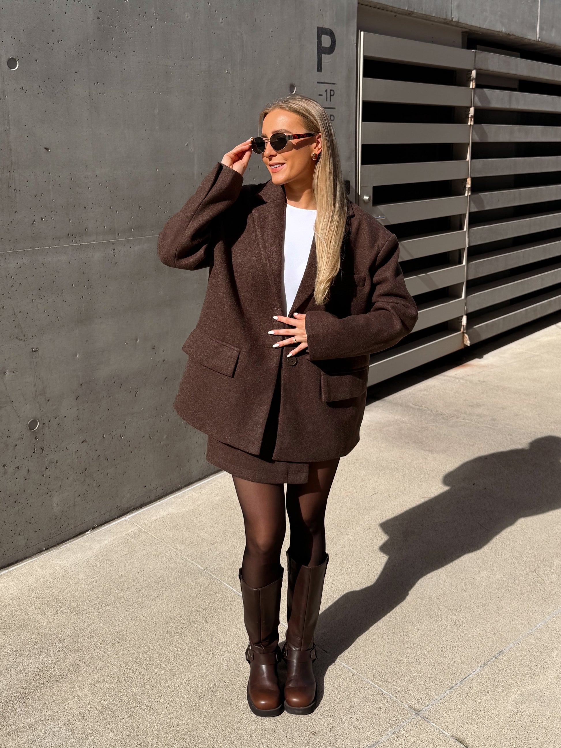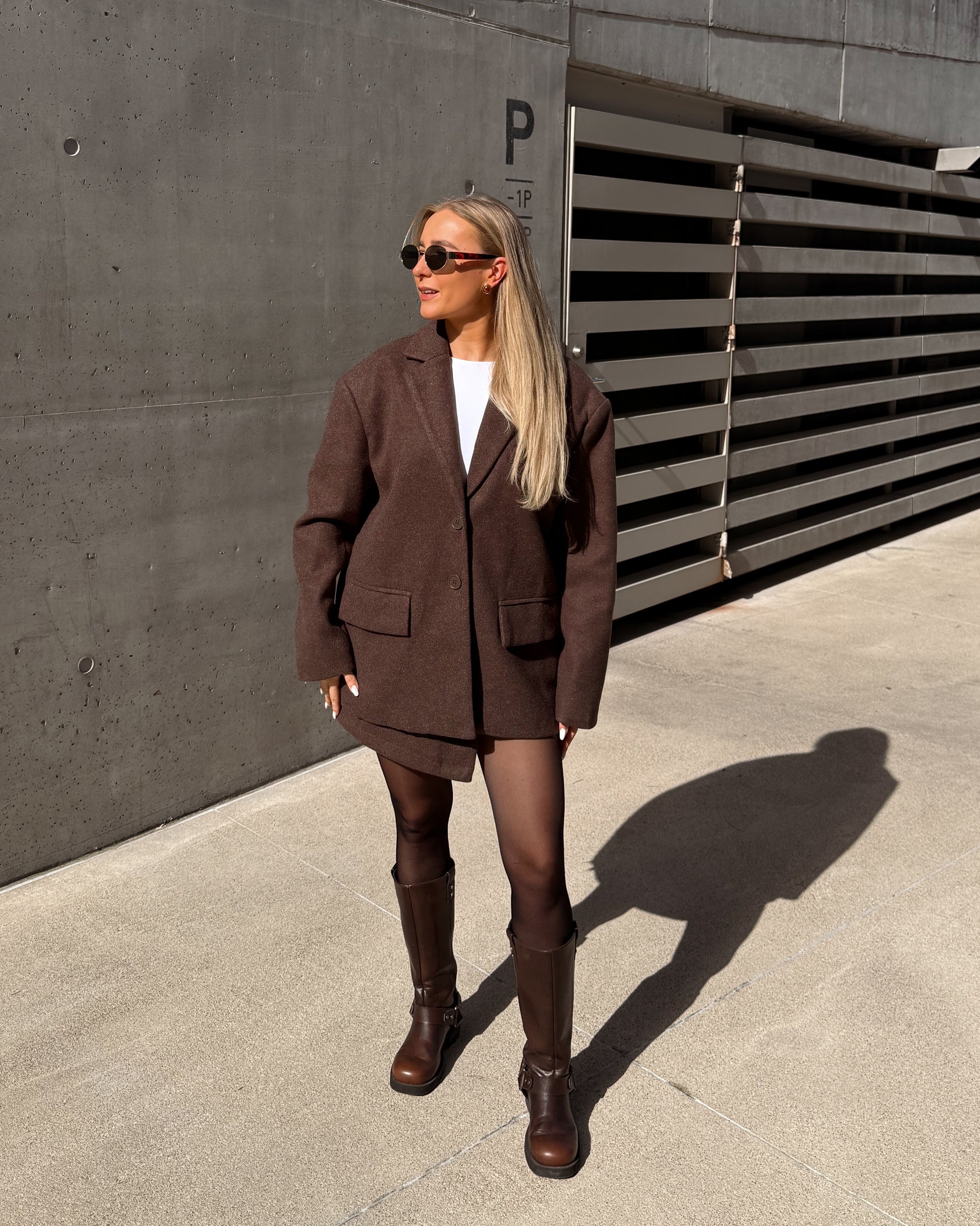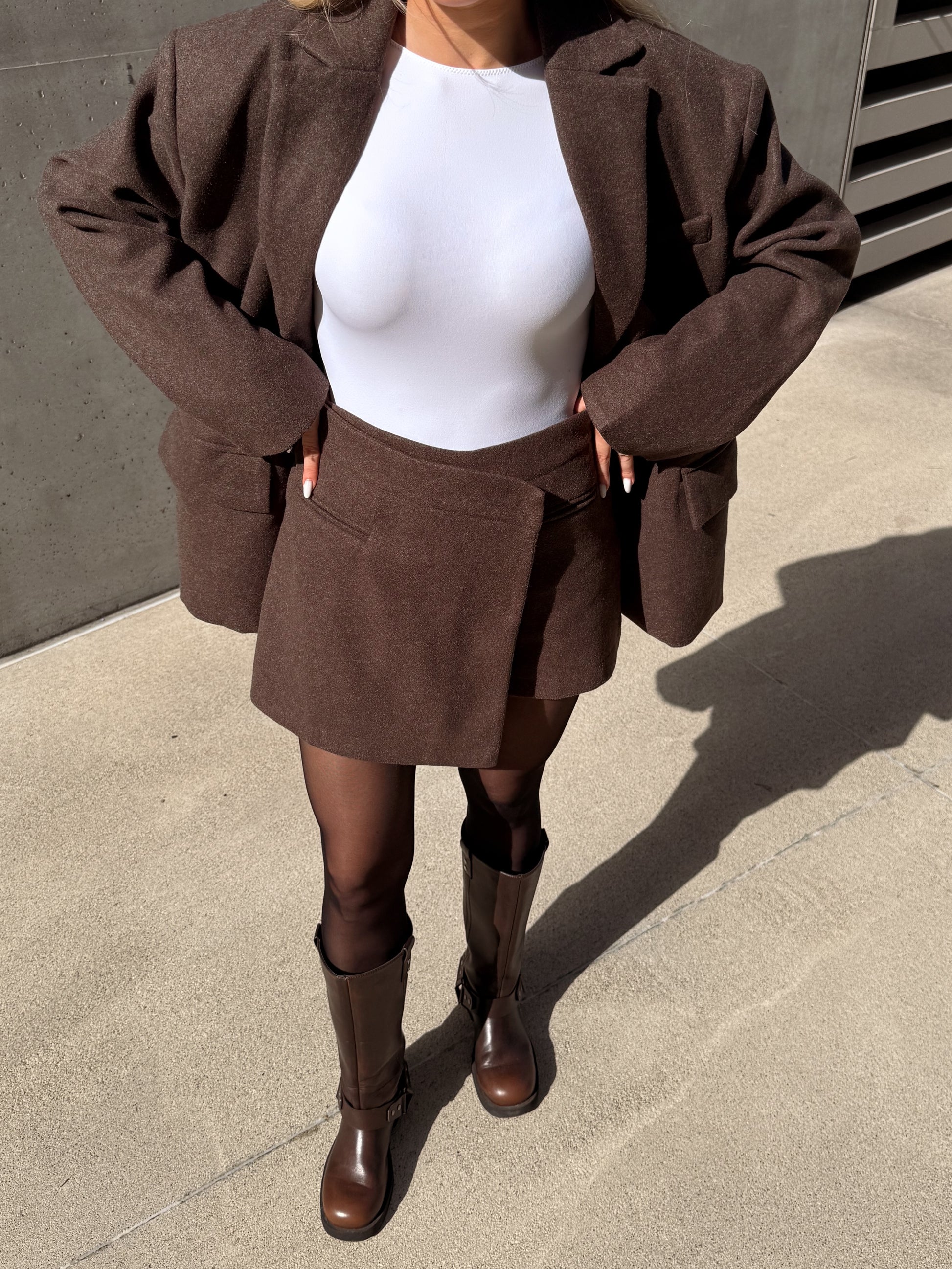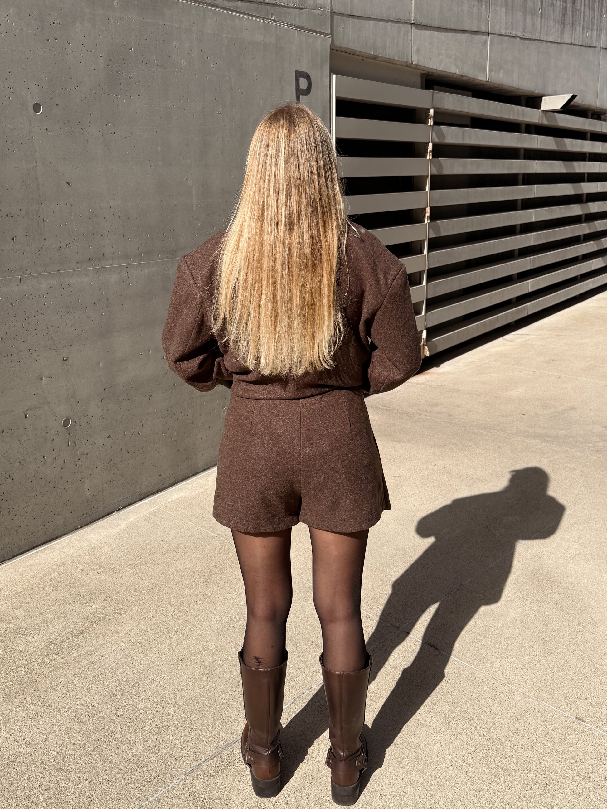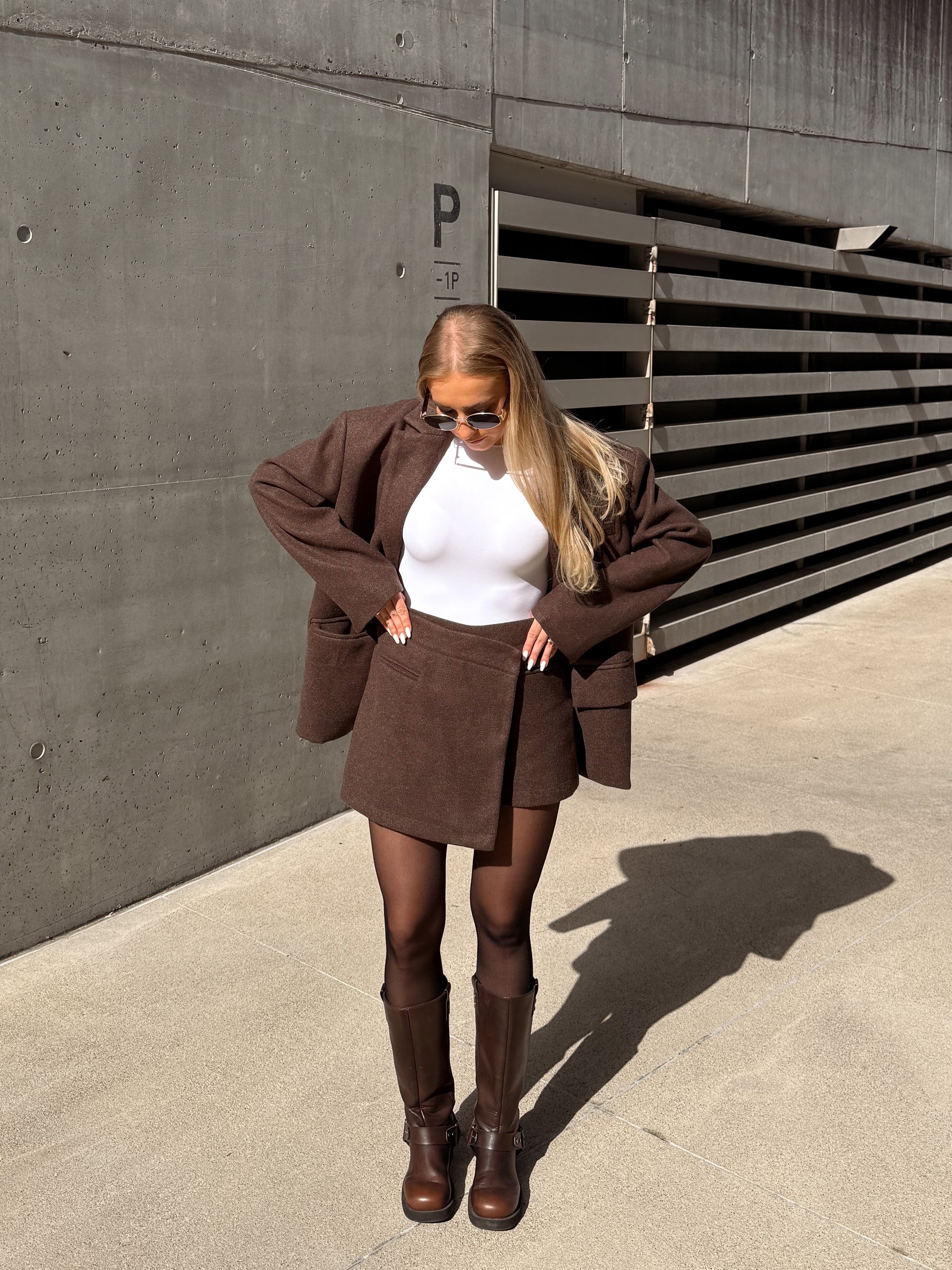 Stilingas dviejų dalių komplektas: oversized tipo švarkas ir sijonšorčiai. Kostiumėlis pasiūtas iš tvirto, kokybiško audinio, kuris išlaiko formą ir atrodo elegantiškai. Puikus pasirinkimas tiek kasdienai, tiek ypatingoms progoms.