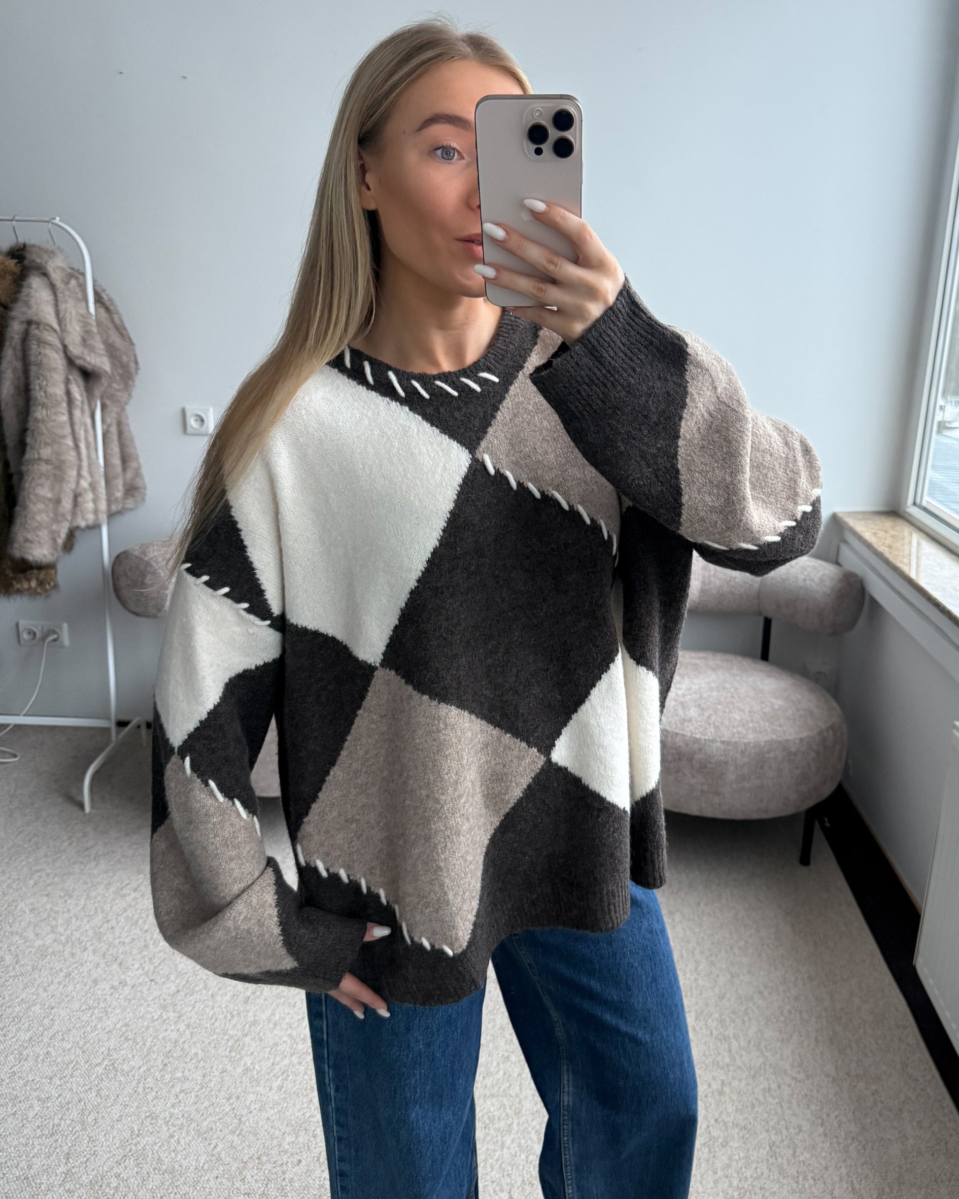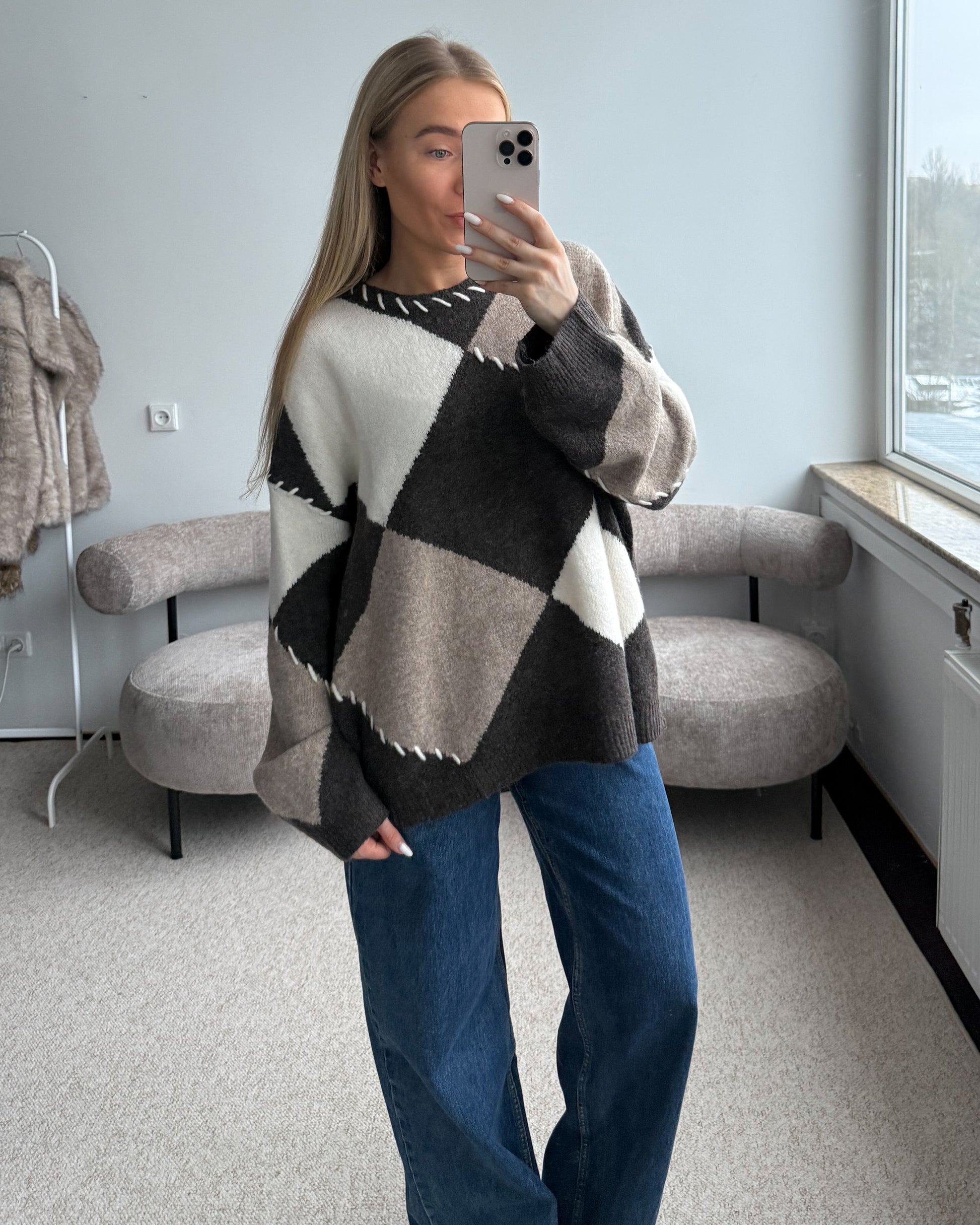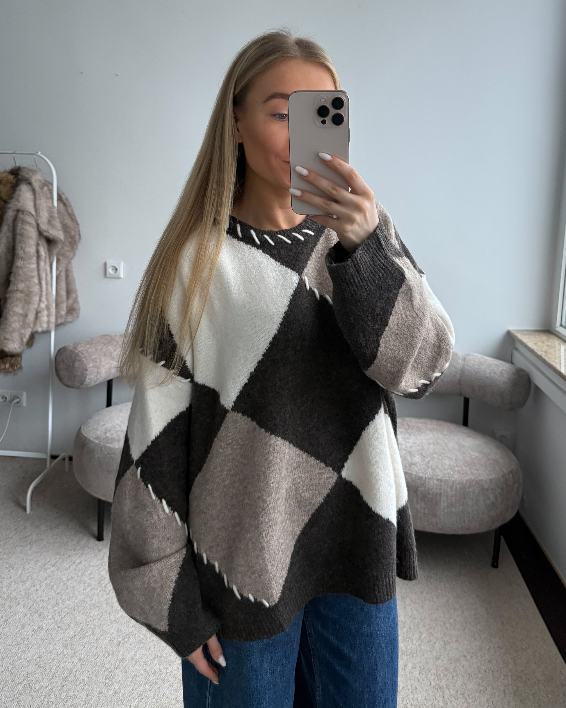 Stilingas, jaukus ir itin minkštas megztinis su išskirtiniu languotu raštu.