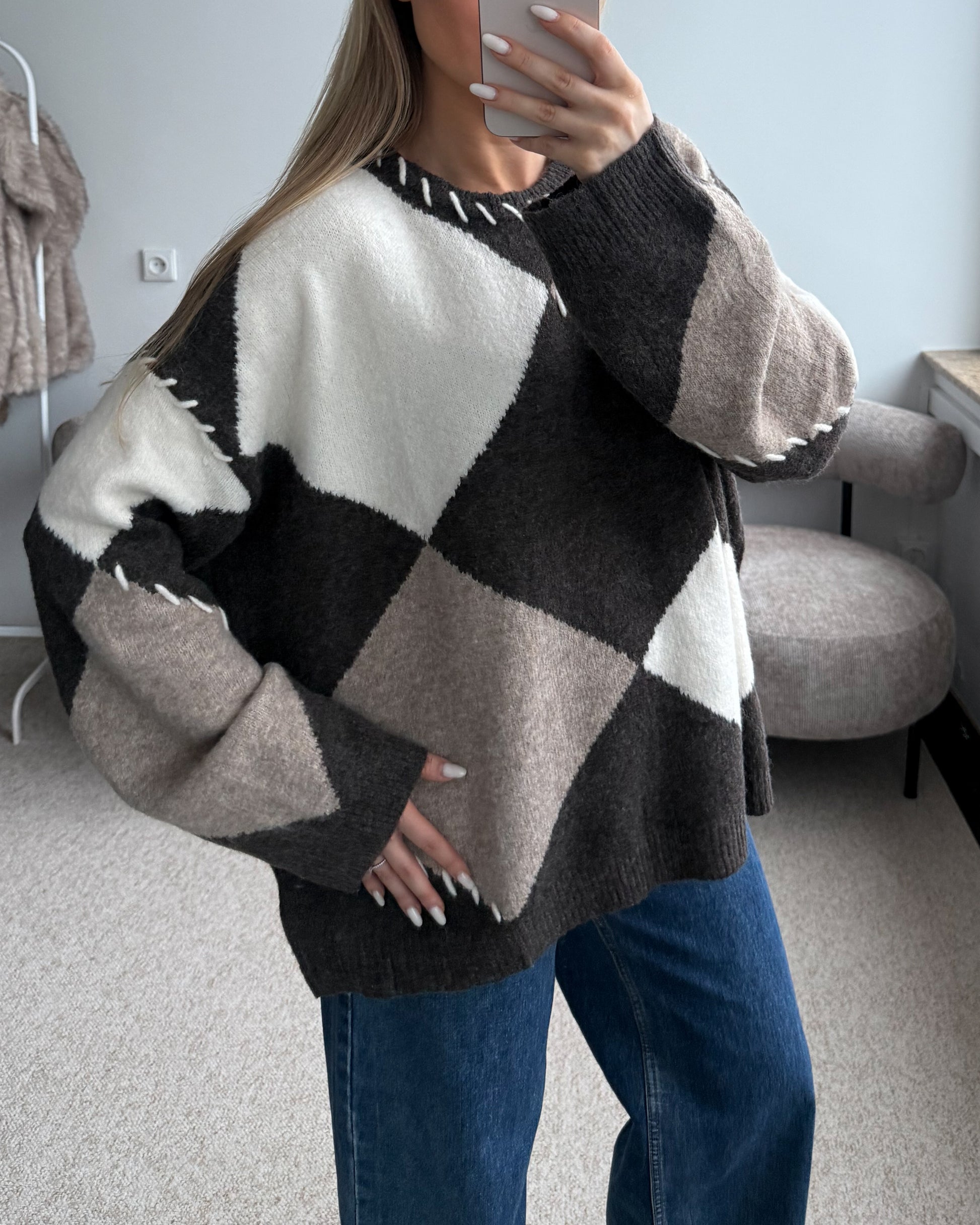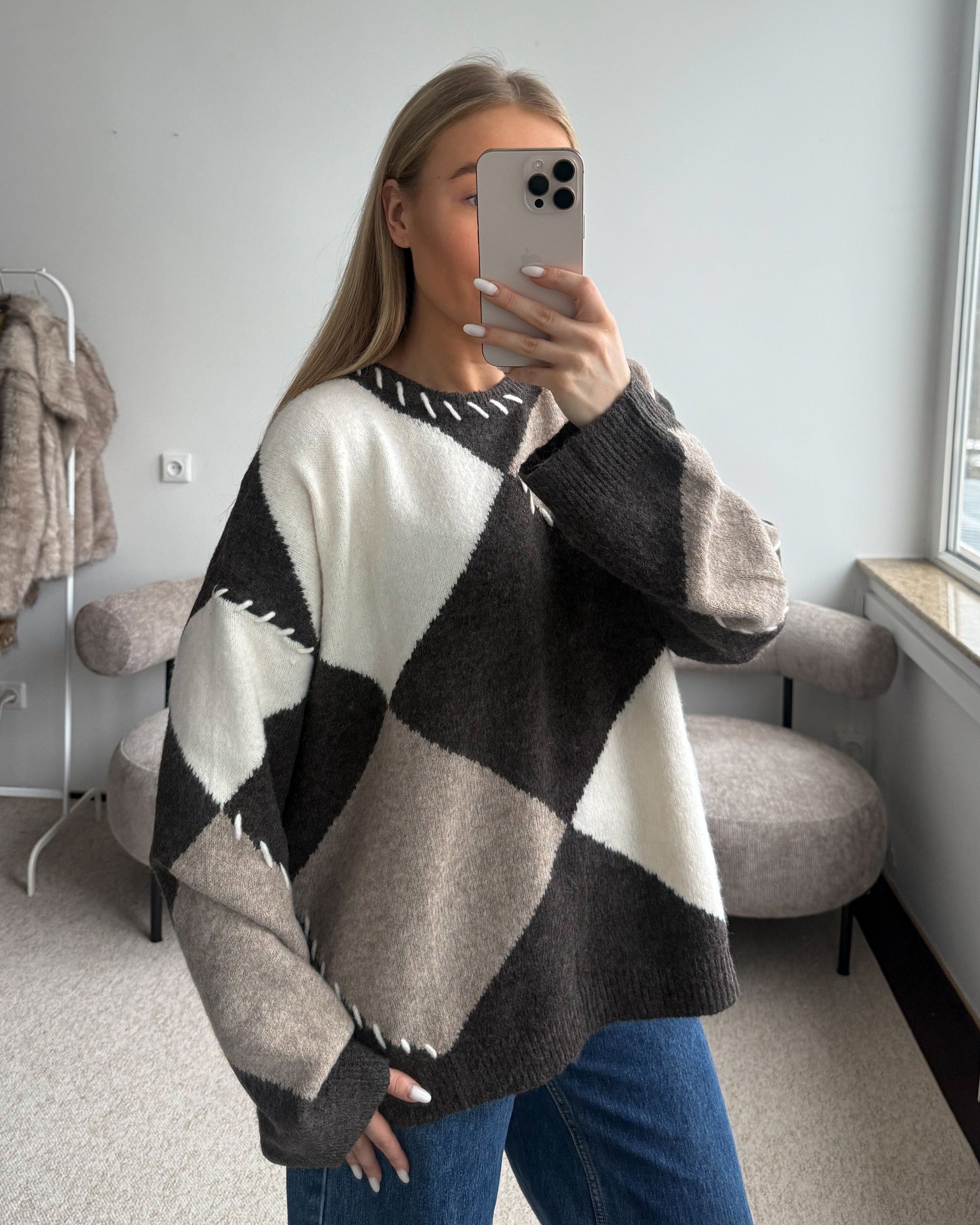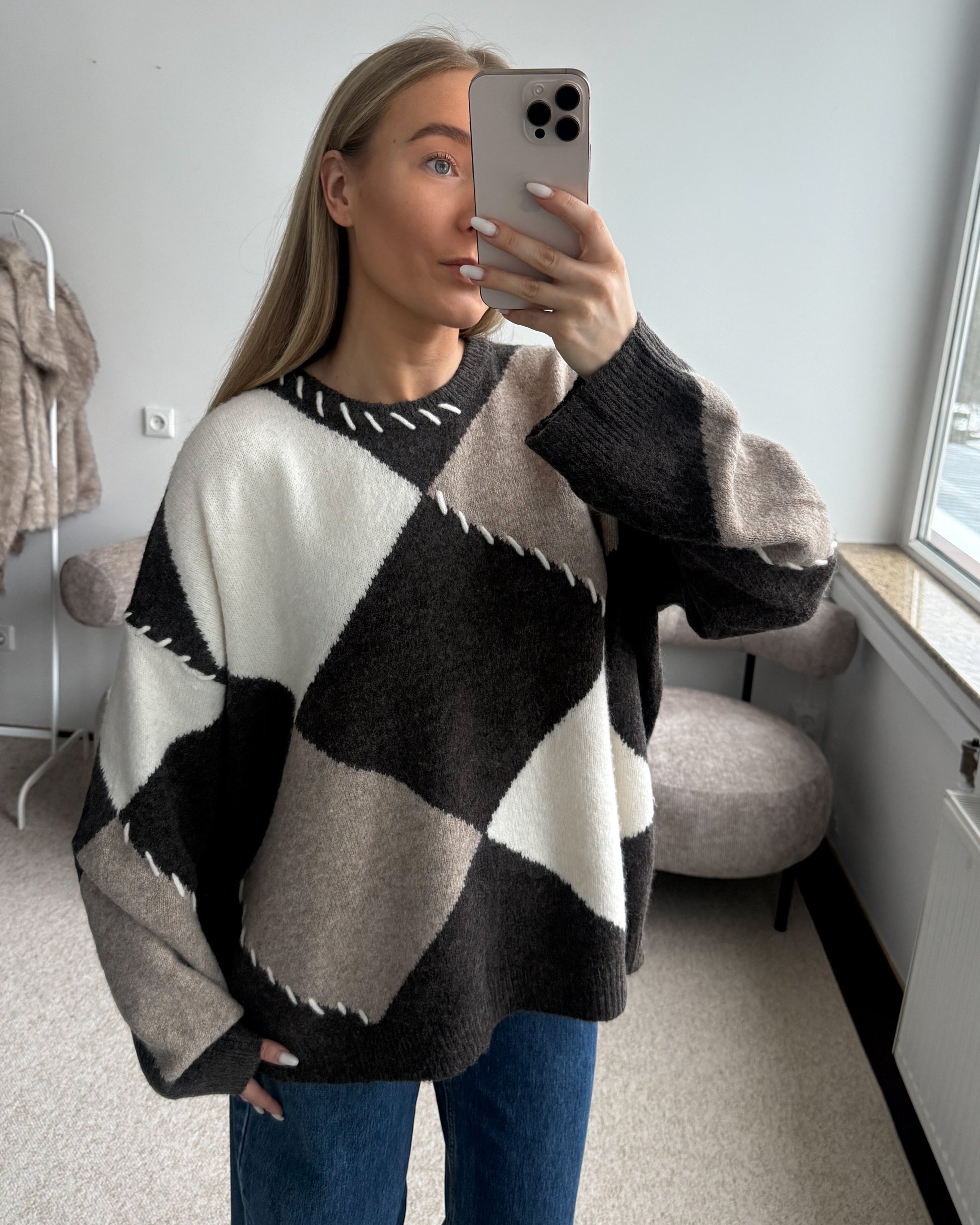 Stilingas, jaukus ir itin minkštas megztinis su išskirtiniu languotu raštu.