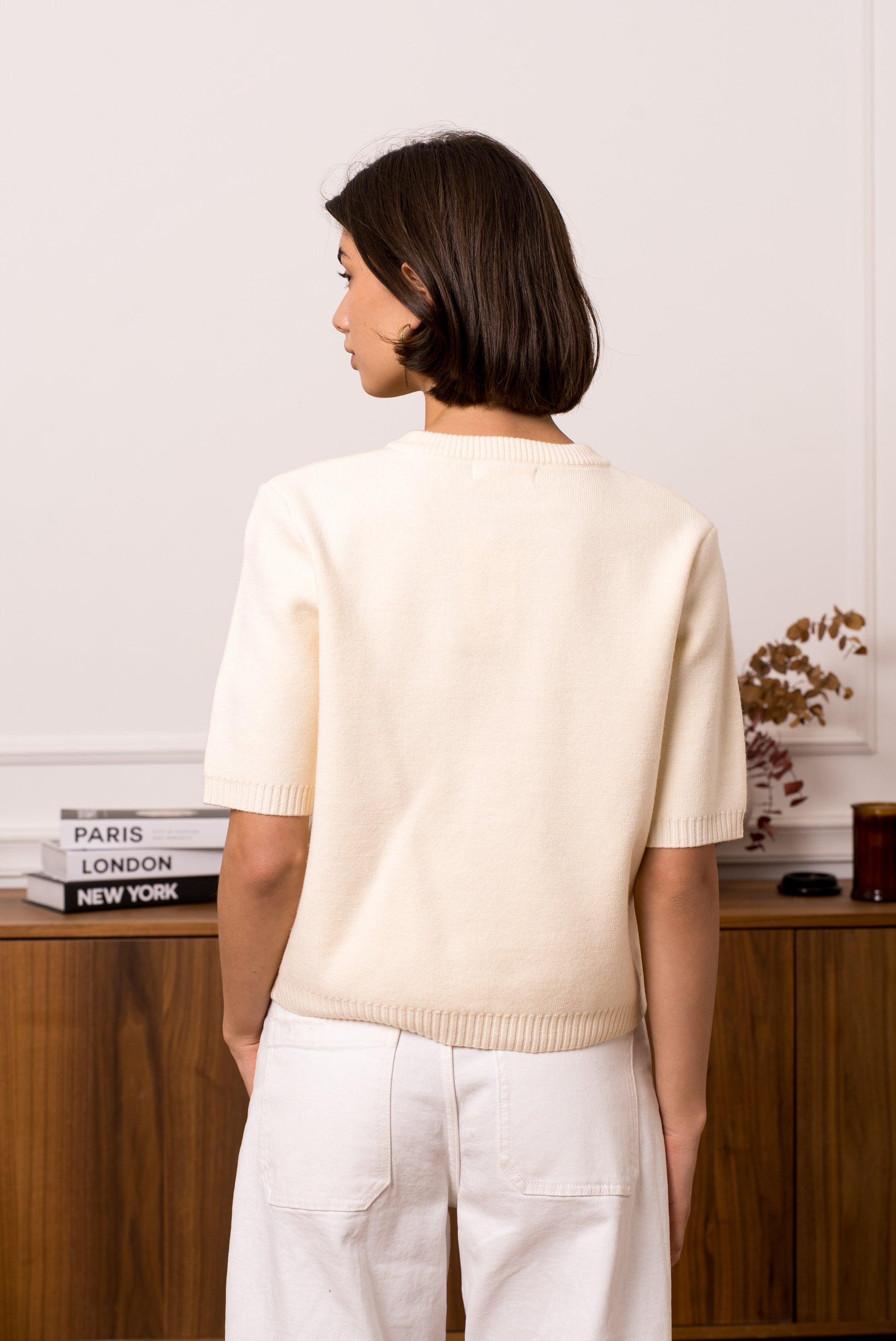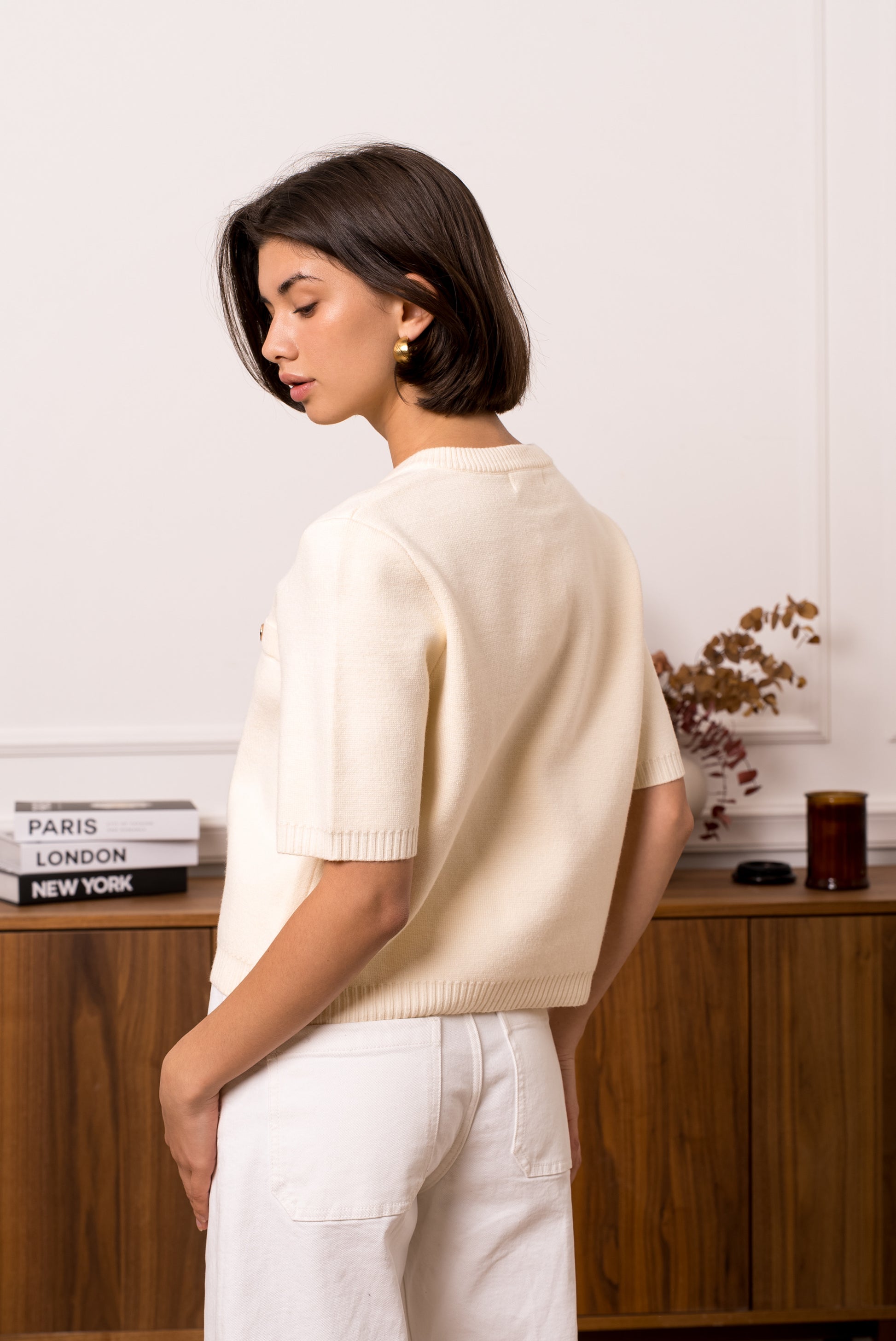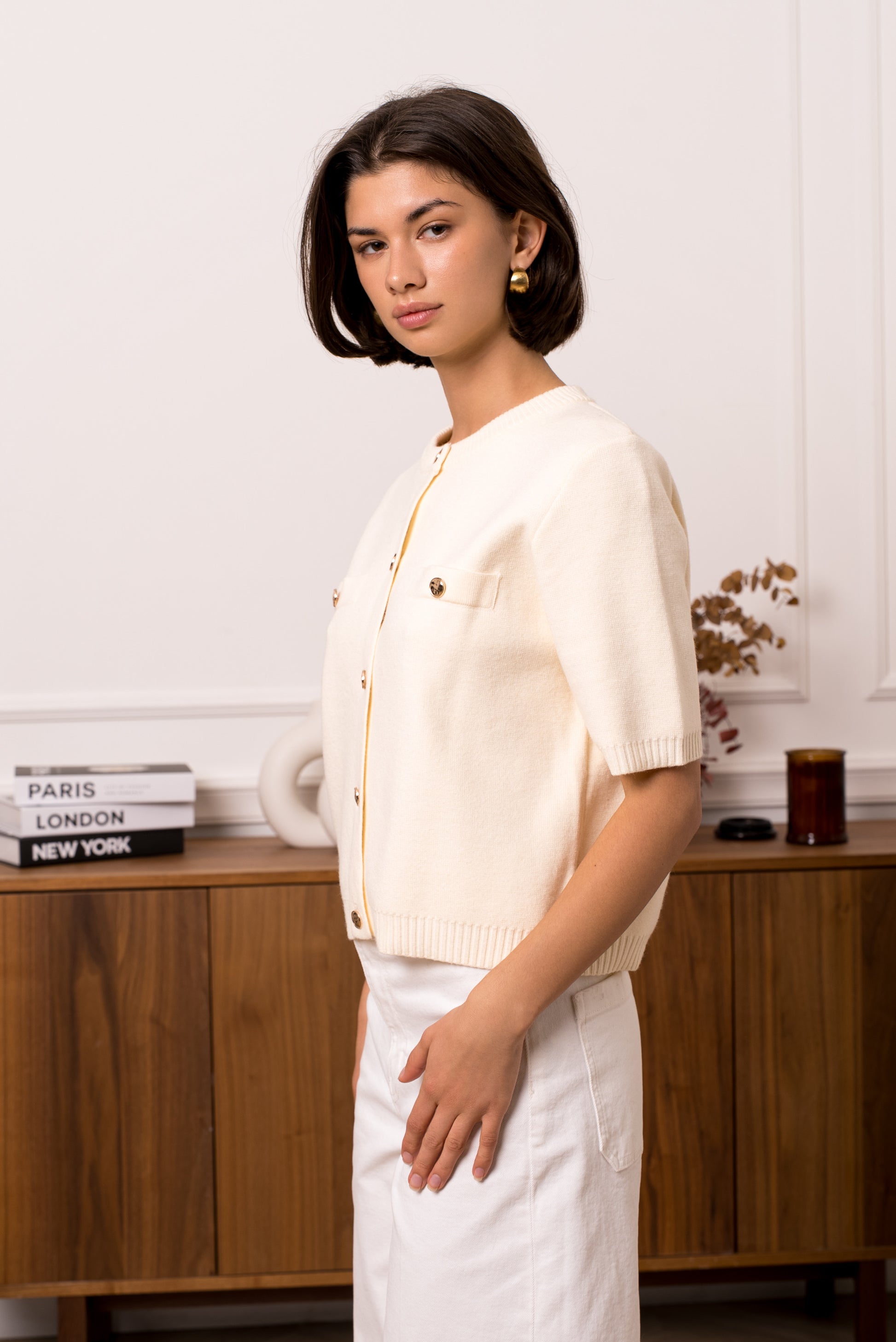Stilingas trumpų rankovių megztukas, pasiūtas iš aukštos kokybės standžios medžiagos, kuri ne tik maloni kūnui, bet ir puikiai laiko formą. Modelis dekoruotas elegantiškomis auksinėmis sagomis bei turi subtilias kišenėles krūtinės srityje.