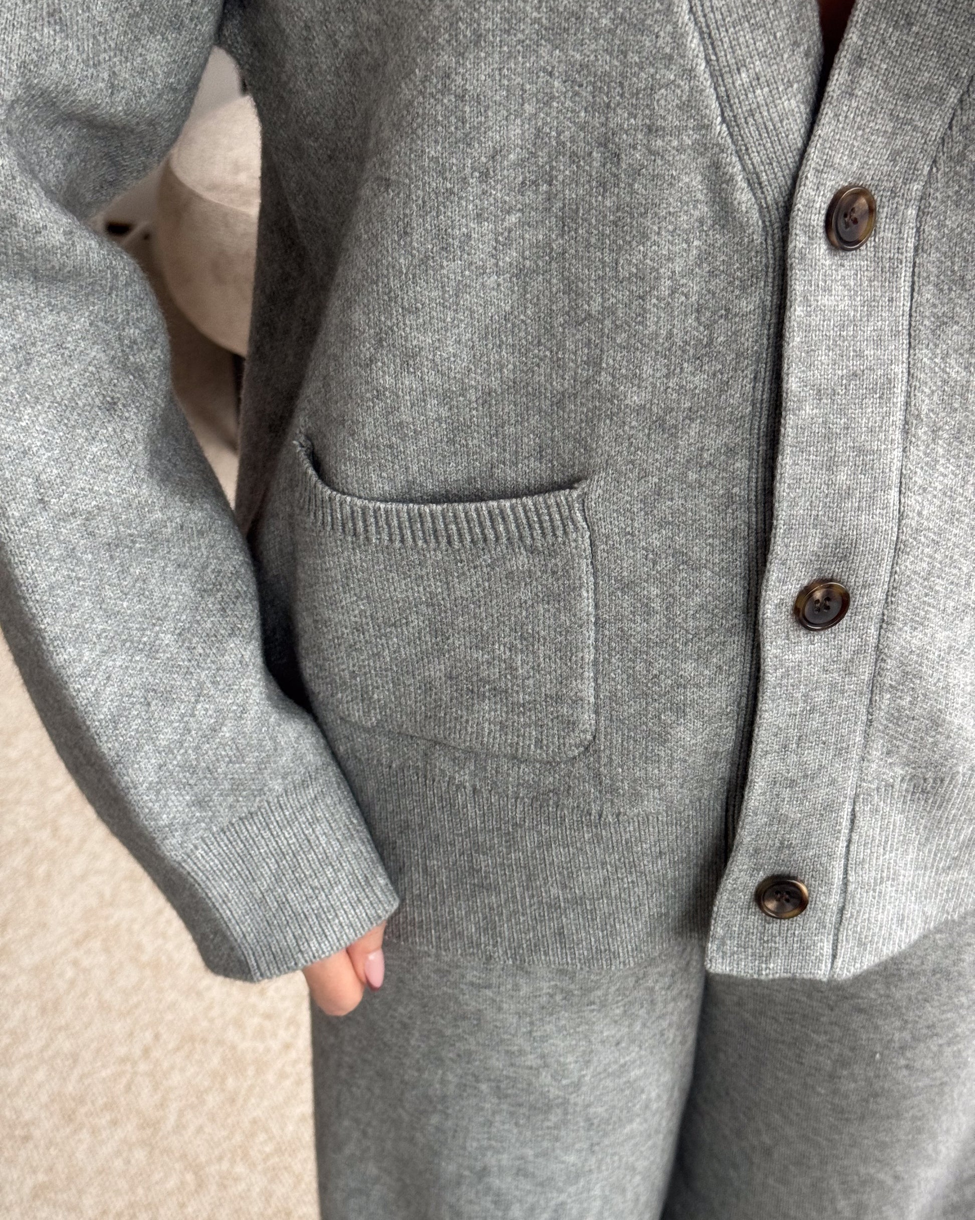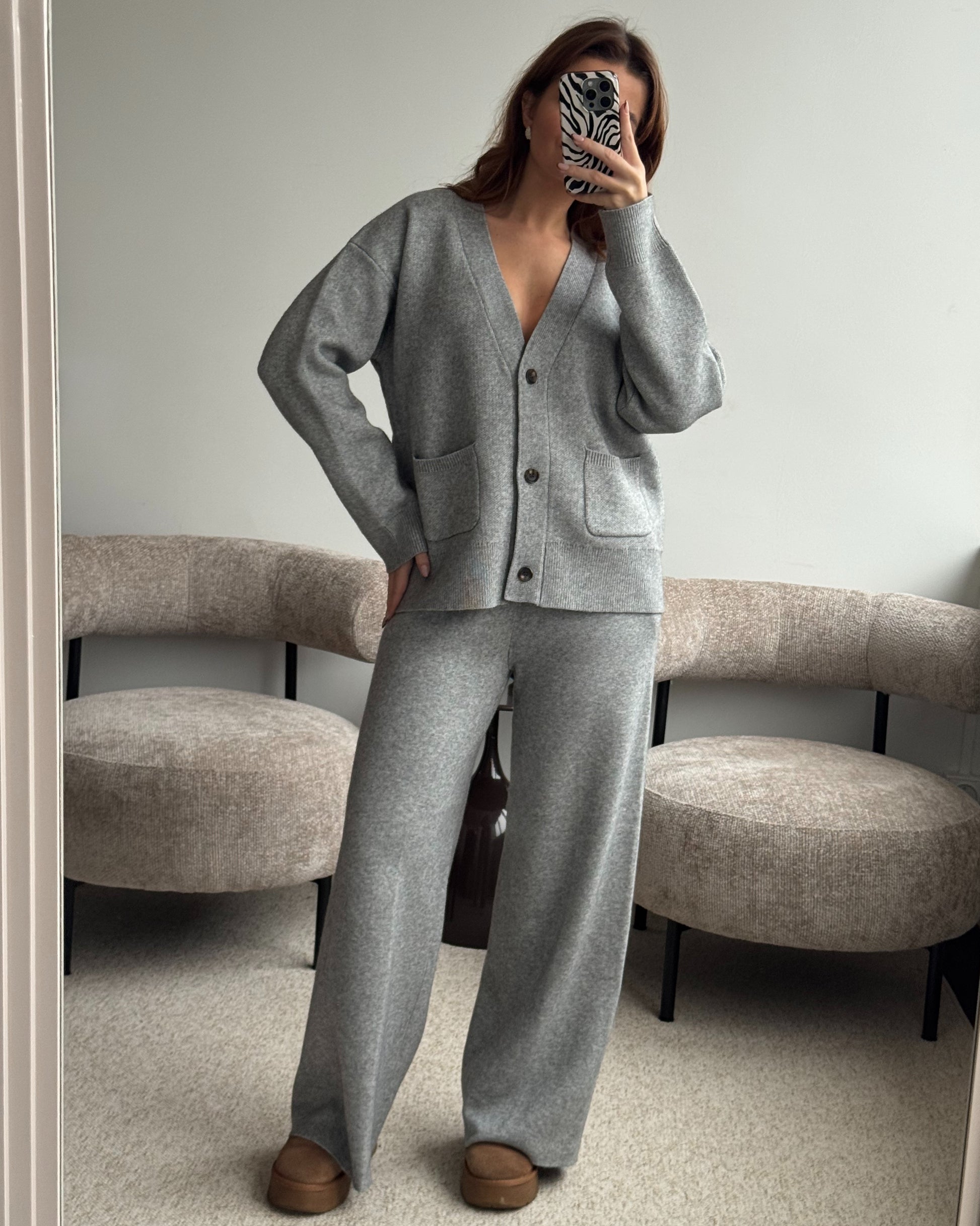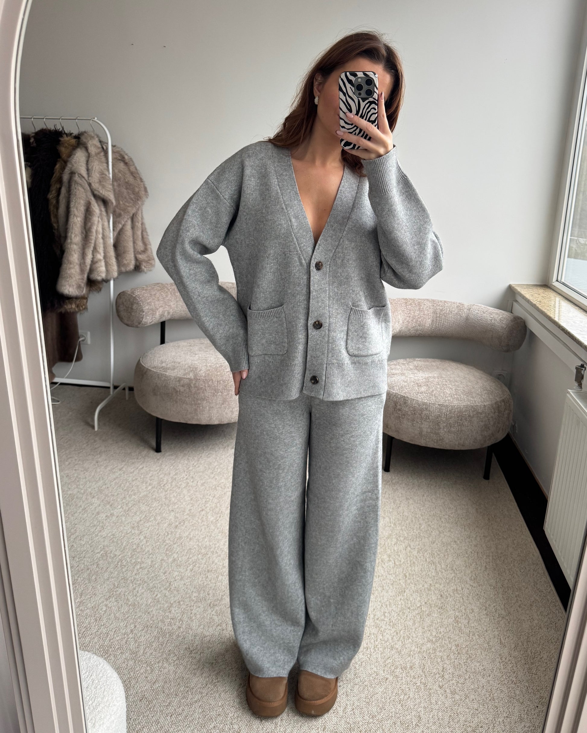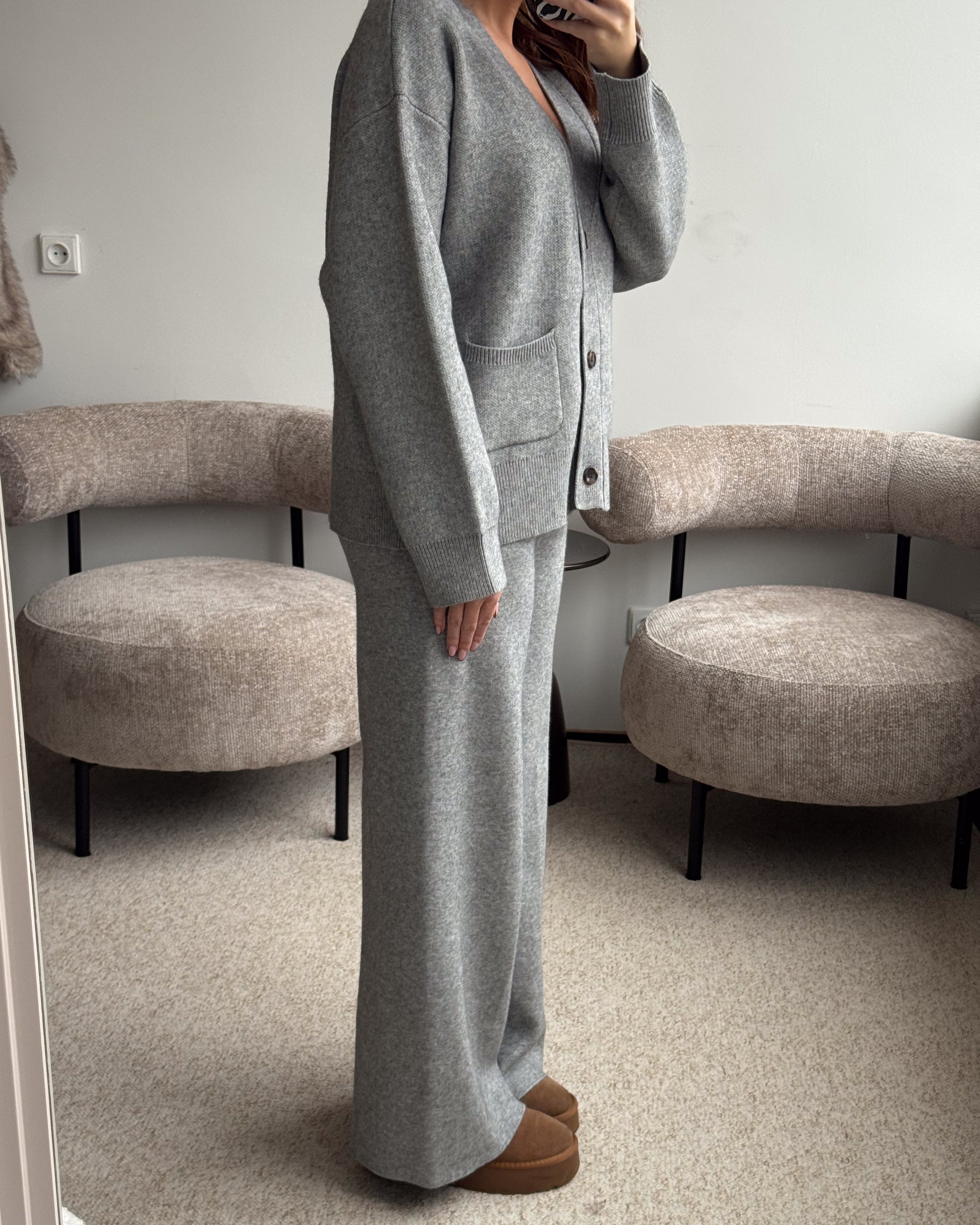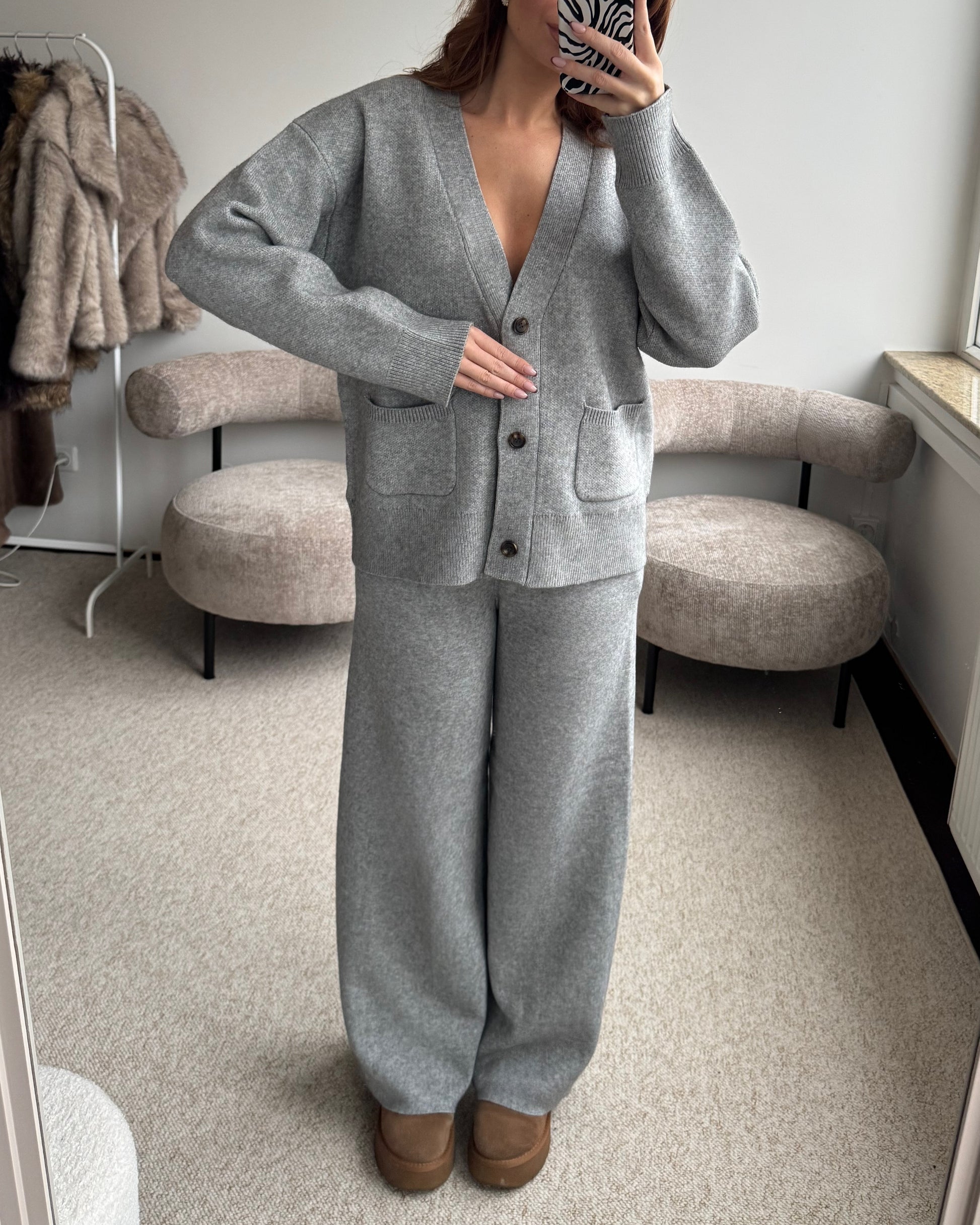 Minkštas, jaukus megztas kostiumėlis, sudarytas iš plačių, tiesaus kirpimo kelnių ir derančio megztinio/kardigano. Kelnės turi tamprią juosmens gumą bei raištelį reguliavimui. Viršutinė dalis - švelni ir universalaus ilgio.