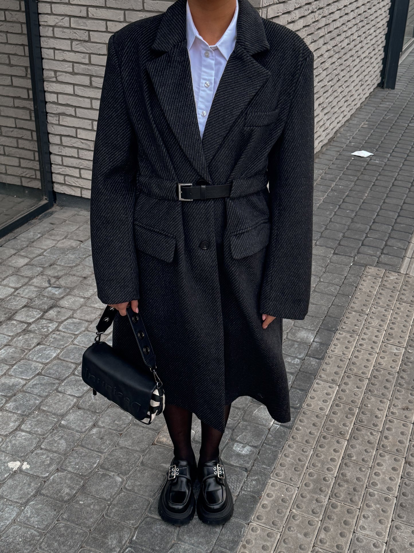 Standžios medžiagos, formą laikantis paltas. Tobulai pabrėžia liemenį - viduje yra įsiūtas diržas.