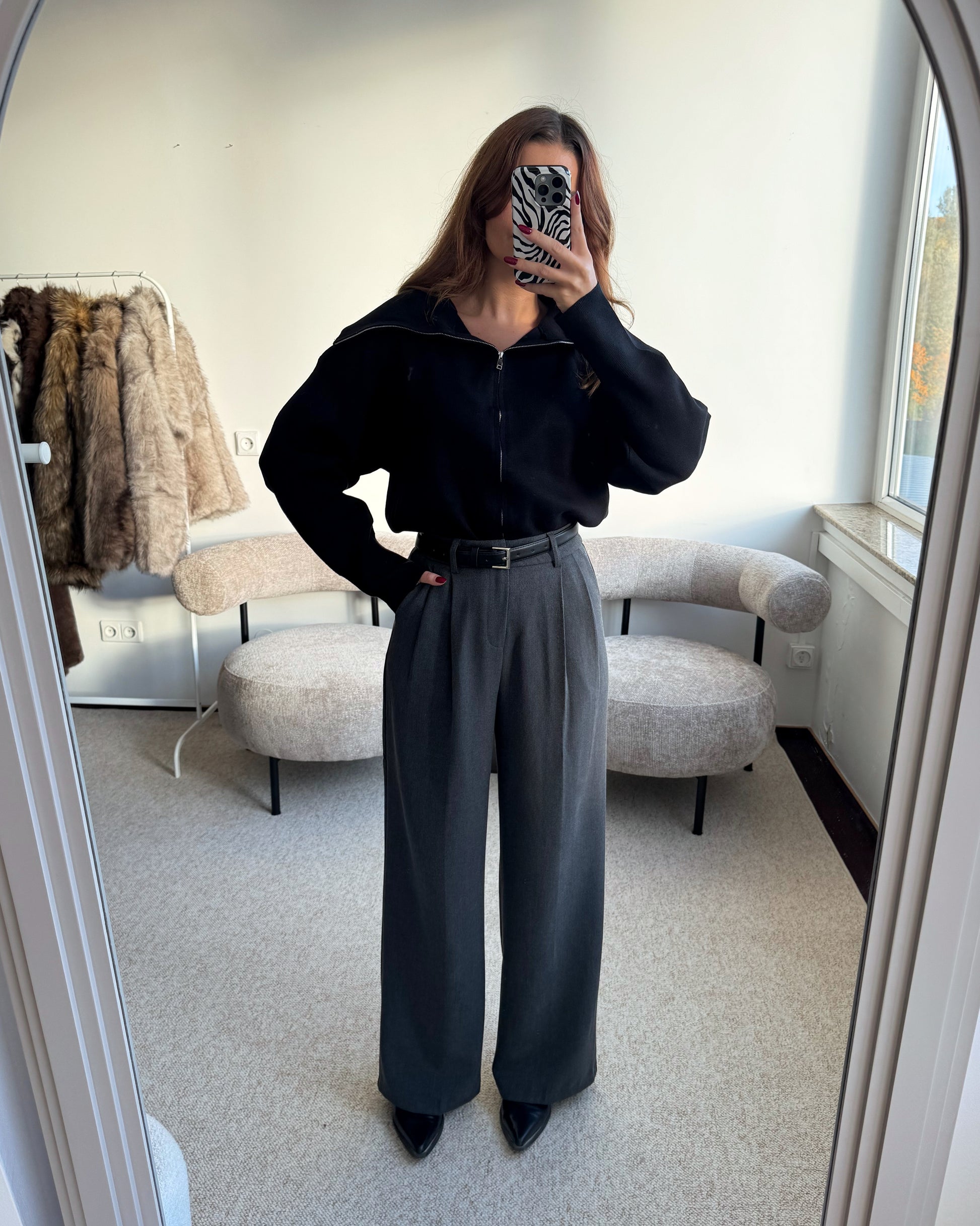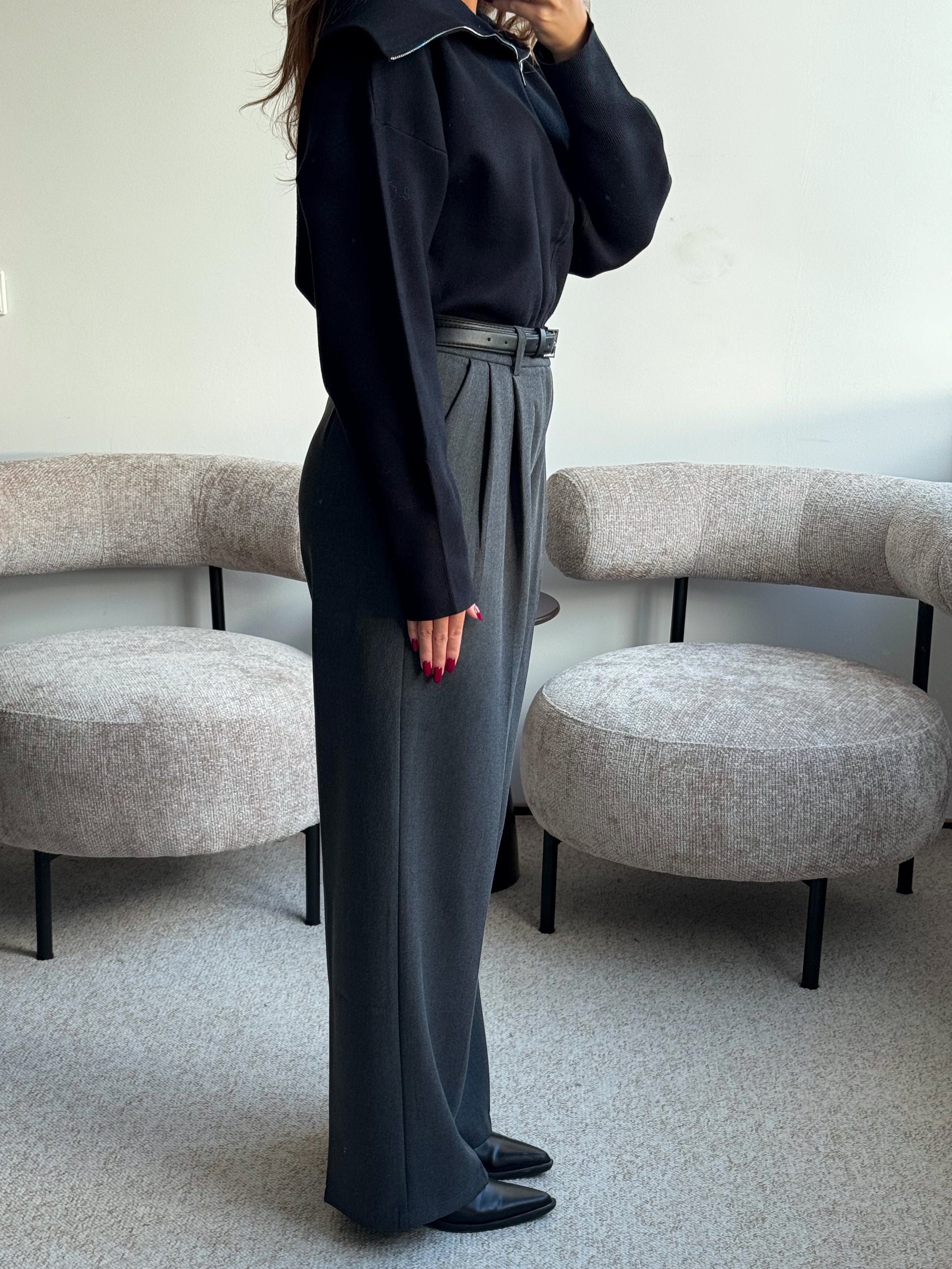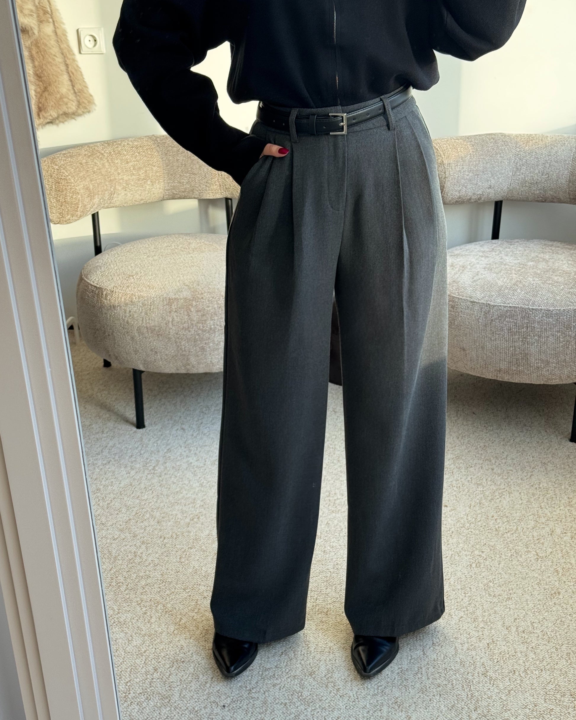 Klasikinio stiliaus tiesaus kirpimo kelnės su aukštu liemeniu. Priekyje - subtilios klostės, suteikiančios elegancijos ir formos. Kelnės pasiūtos iš standaus, tačiau lengvai krintančio audinio, kuris išlaiko struktūrą ir patogiai priglunda prie kūno. Komplekte yra dirželis iš eko odos. Užsegimas priekyje su sagute ir užtrauktuku, dvi šoninės kišenės.