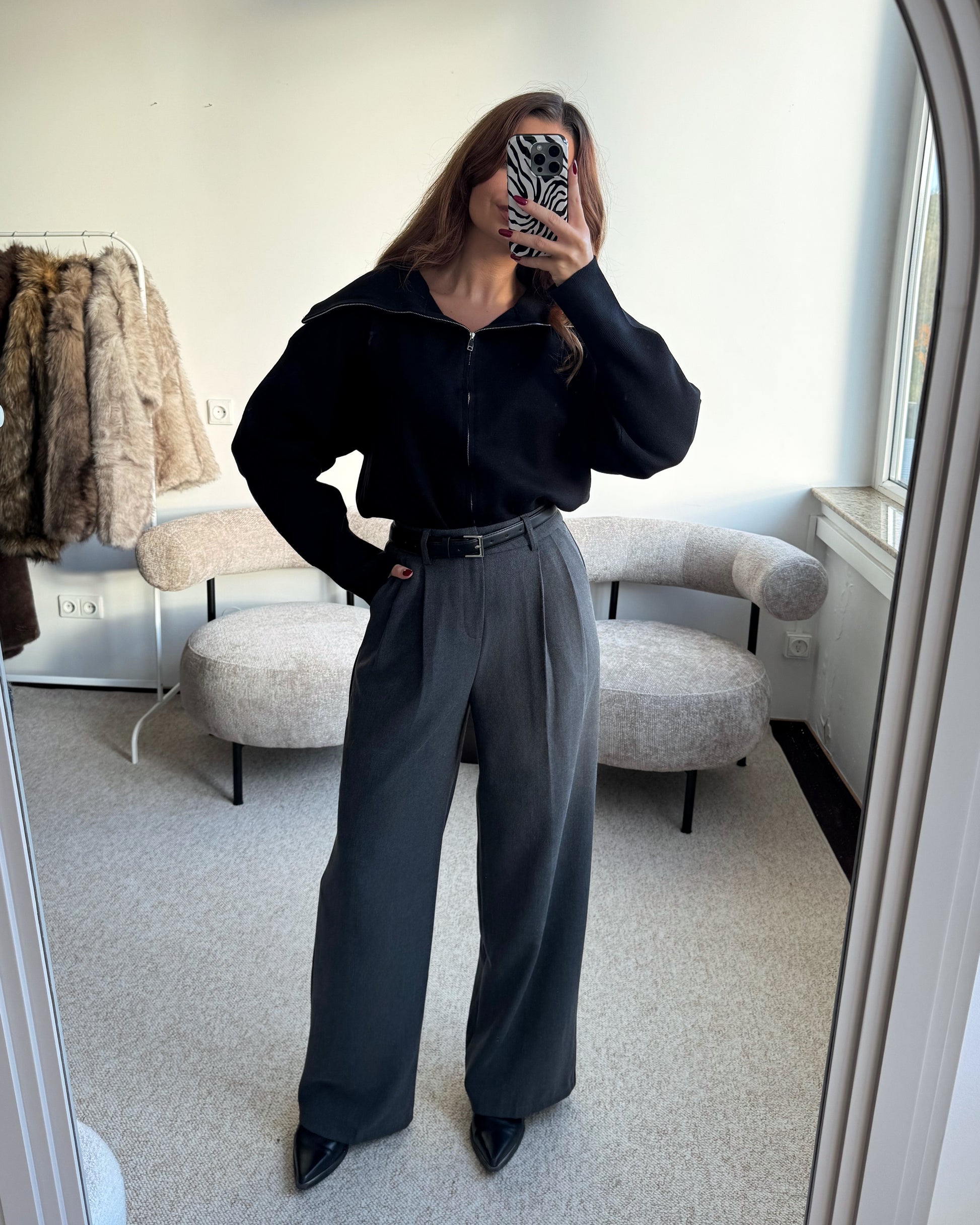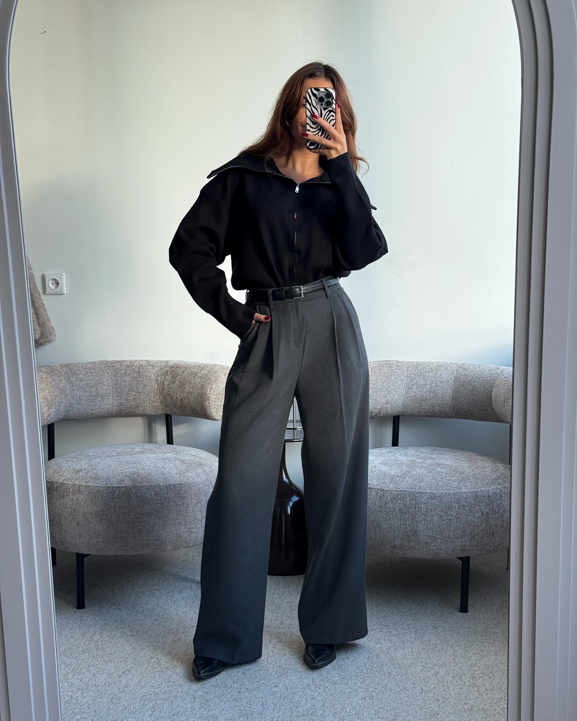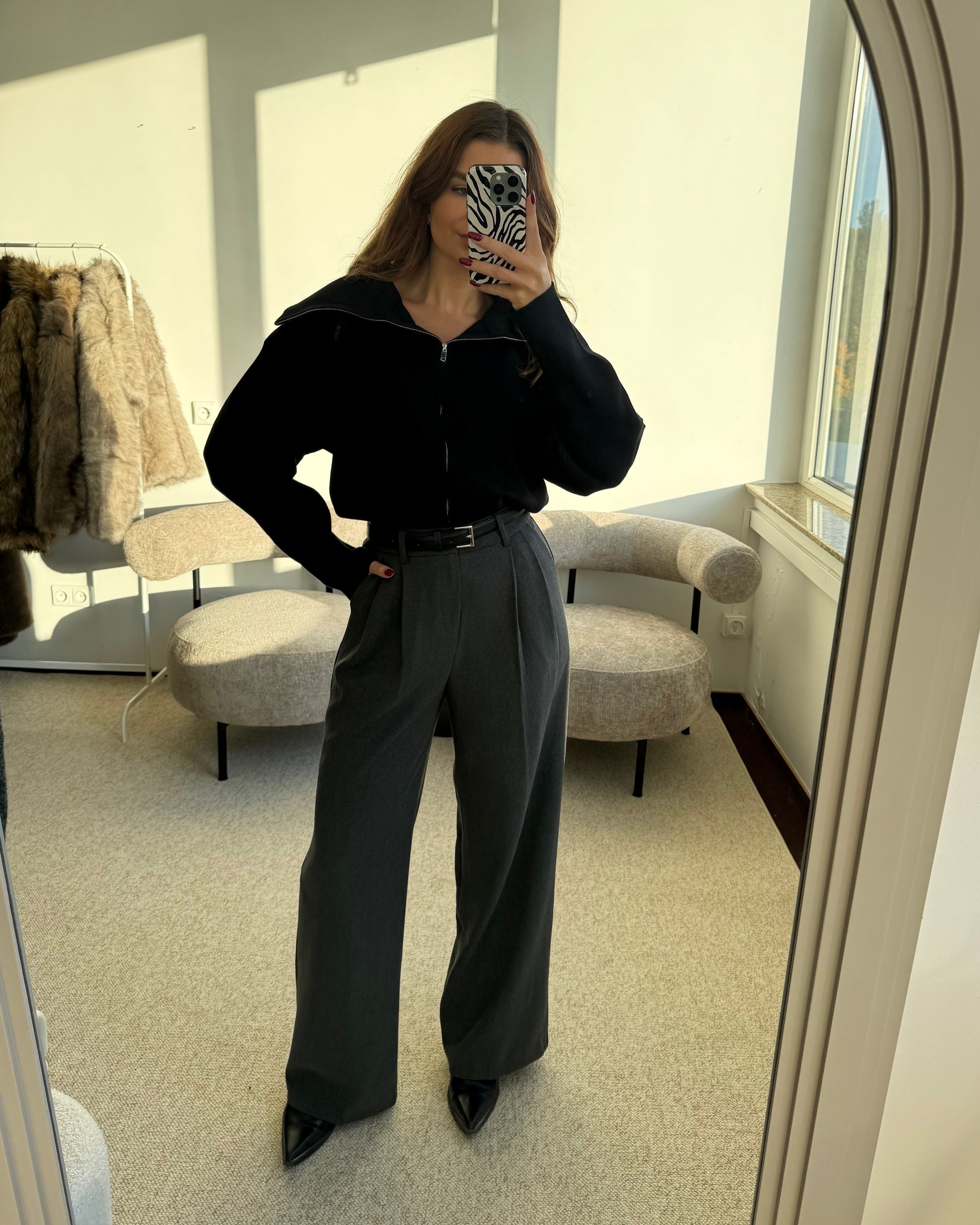 Klasikinio stiliaus tiesaus kirpimo kelnės su aukštu liemeniu. Priekyje - subtilios klostės, suteikiančios elegancijos ir formos. Kelnės pasiūtos iš standaus, tačiau lengvai krintančio audinio, kuris išlaiko struktūrą ir patogiai priglunda prie kūno. Komplekte yra dirželis iš eko odos. Užsegimas priekyje su sagute ir užtrauktuku, dvi šoninės kišenės.