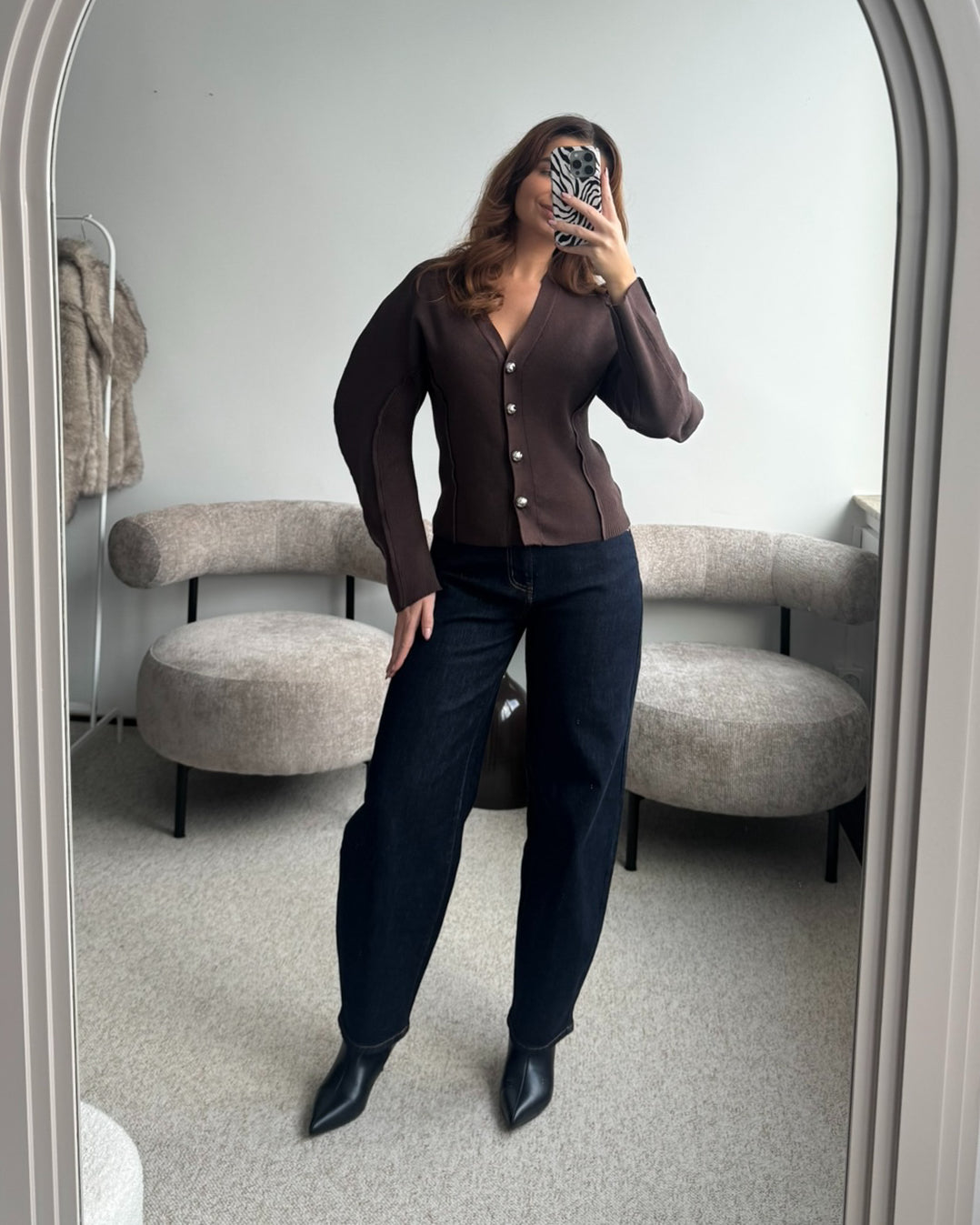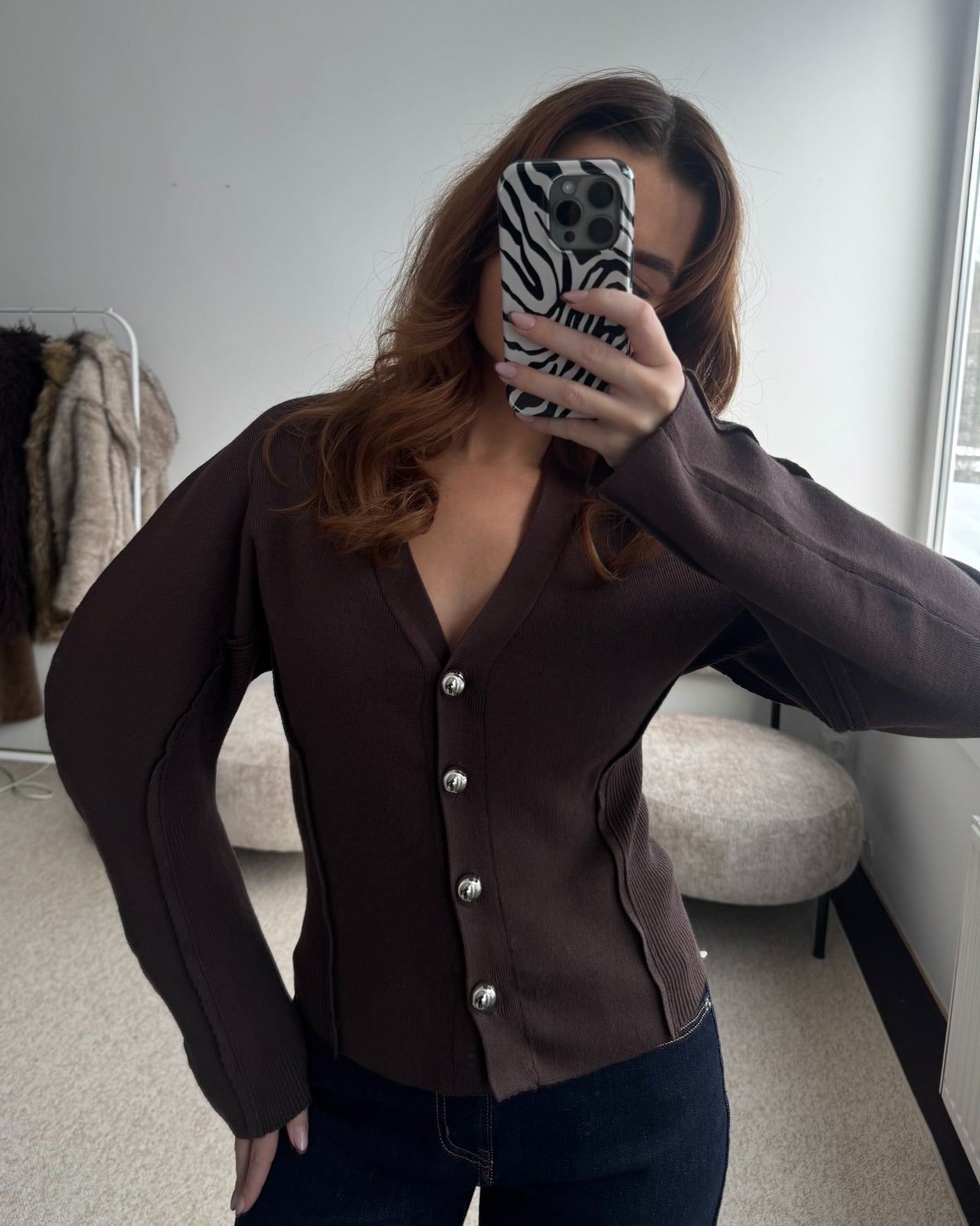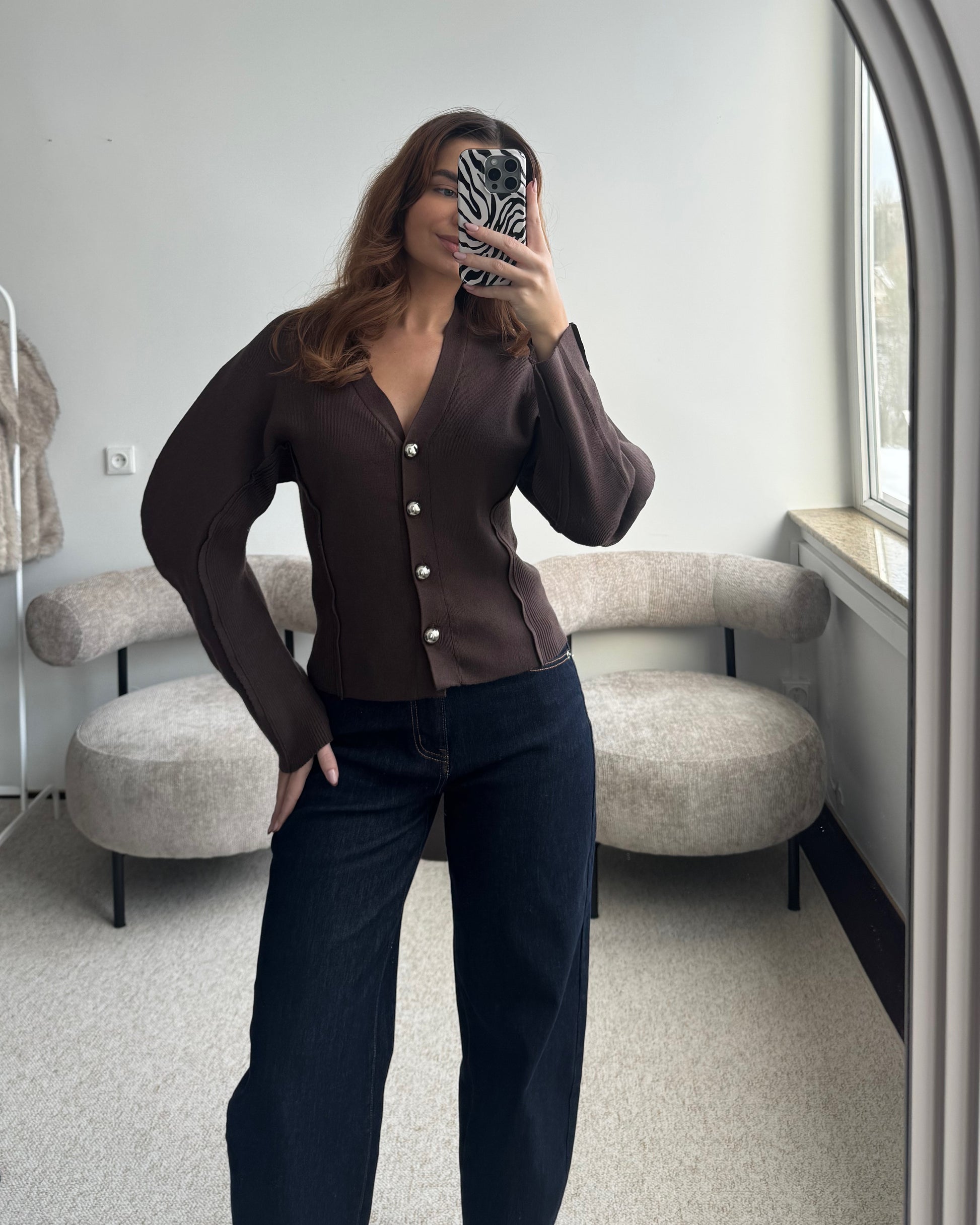 Modelis turi subtilų susiaurėjimą ties liemeniu, todėl gražiai pabrėžia figūrą ir suteikia išraiškingą siluetą. Platus, įspūdingas rankovių kirpimas suteikia kardiganui išskirtinumo, o siauresnės rankogalių dalys sukuria kontrastą ir dar labiau išryškina liemenį.