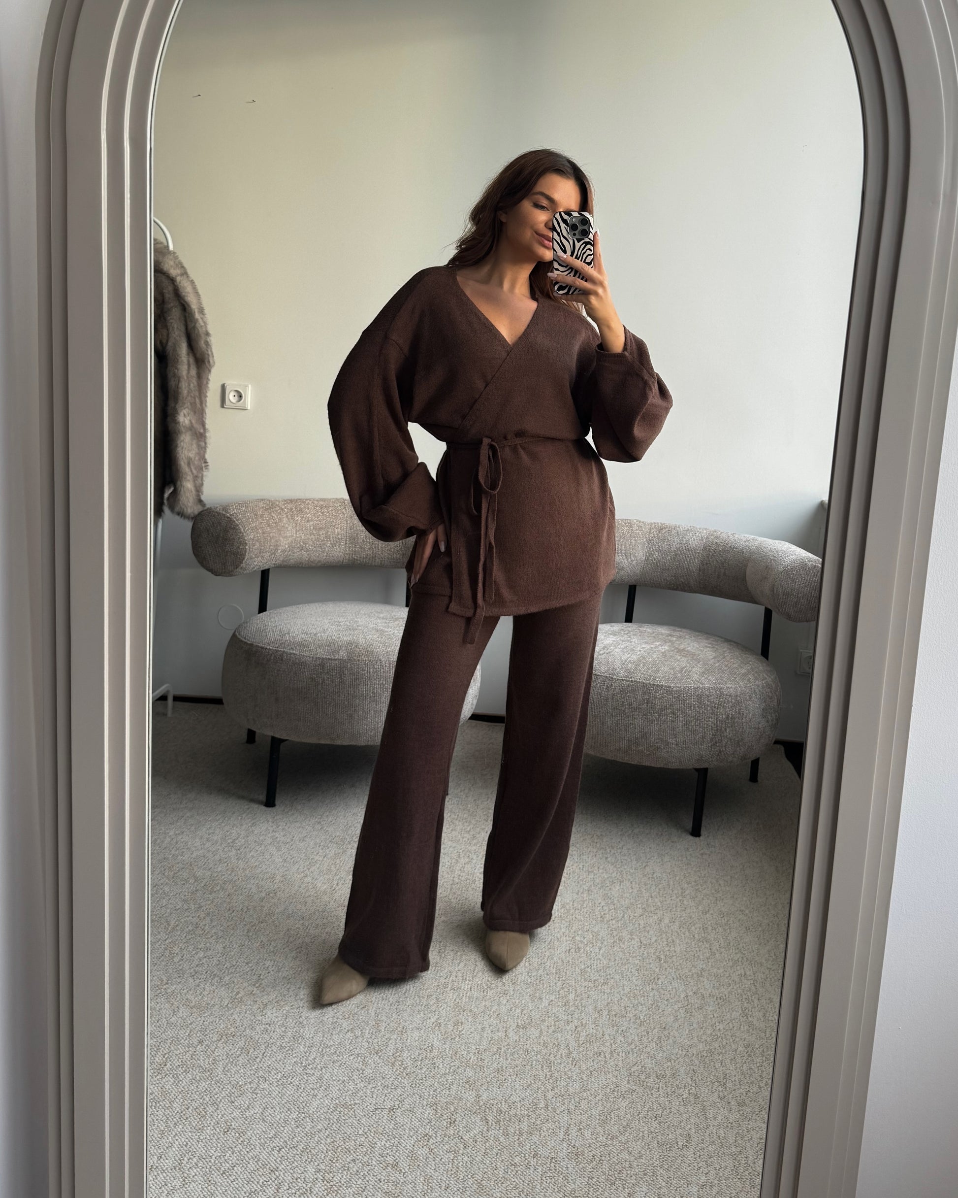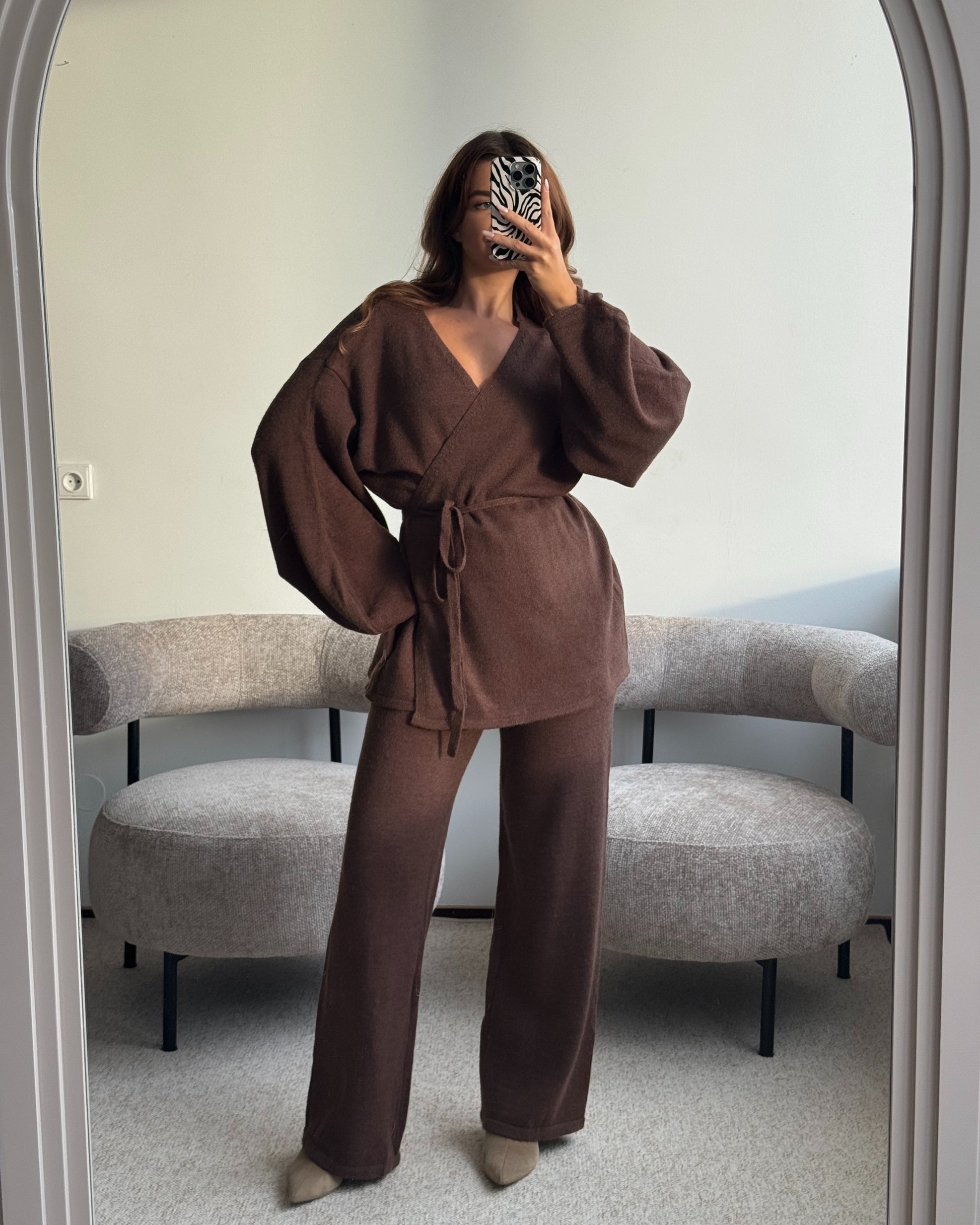 Komplektą sudaro kimono tipo megztukas su dirželiu, leidžiančiu pabrėžti liemenį, ir laisvo kritimo kelnės.
