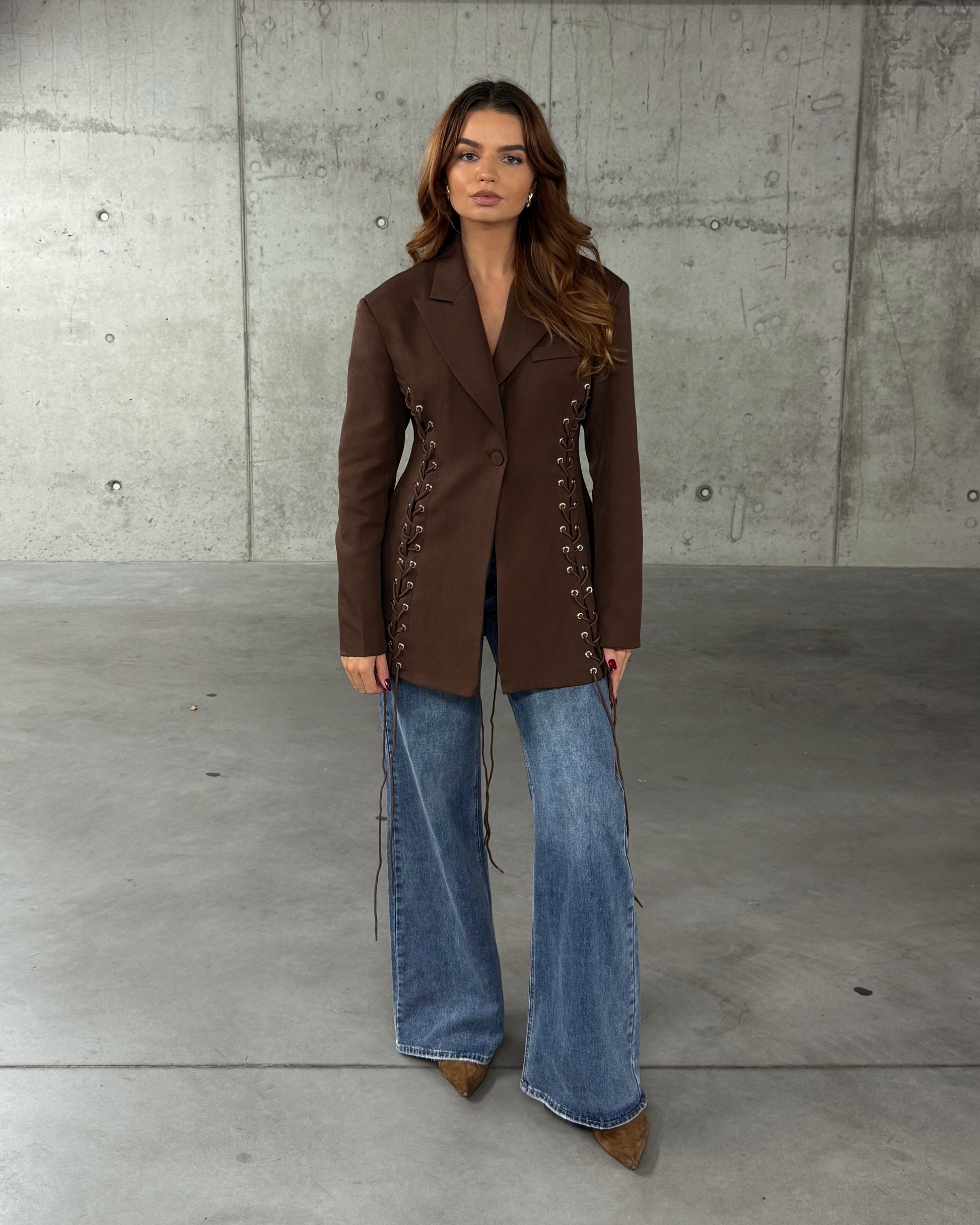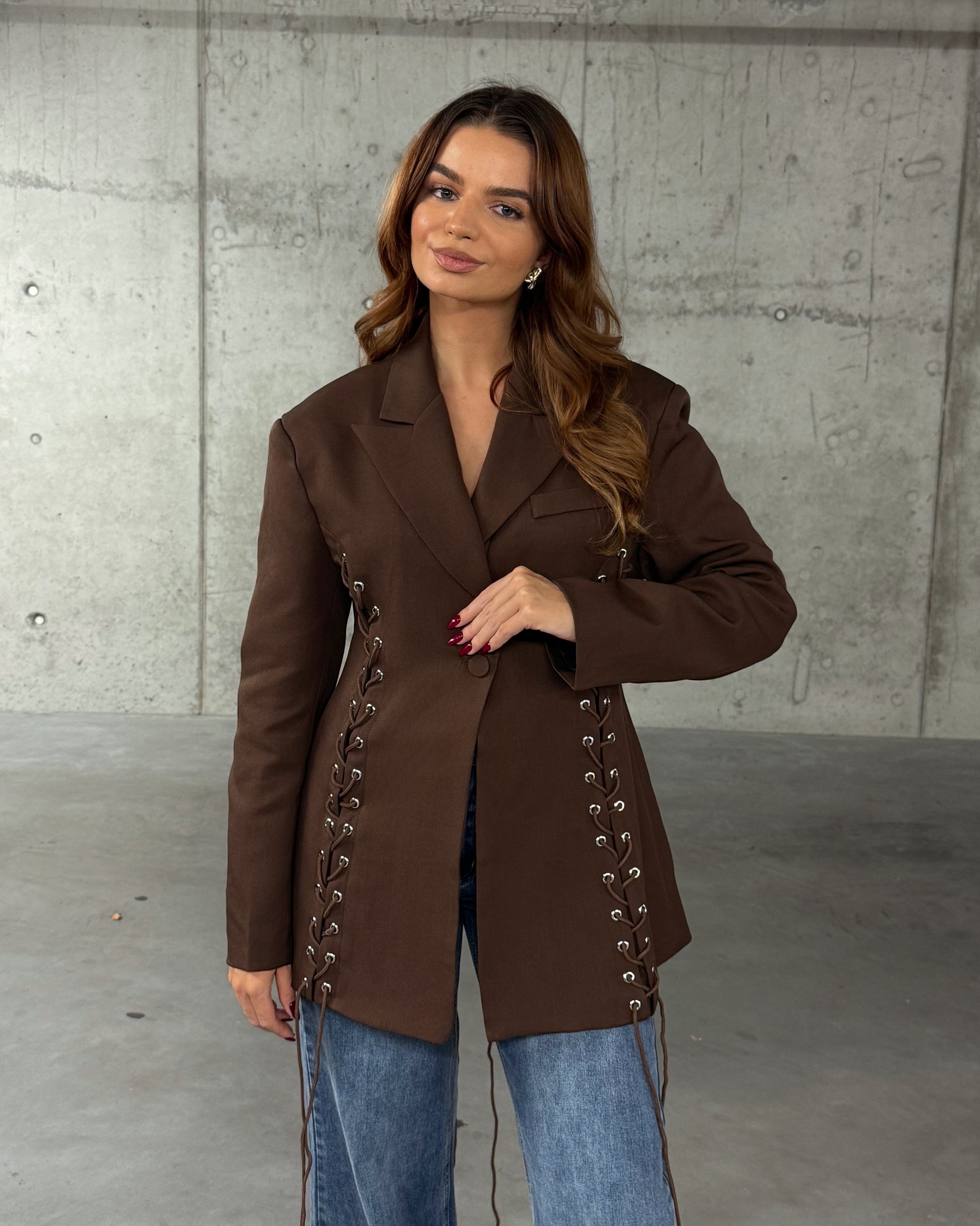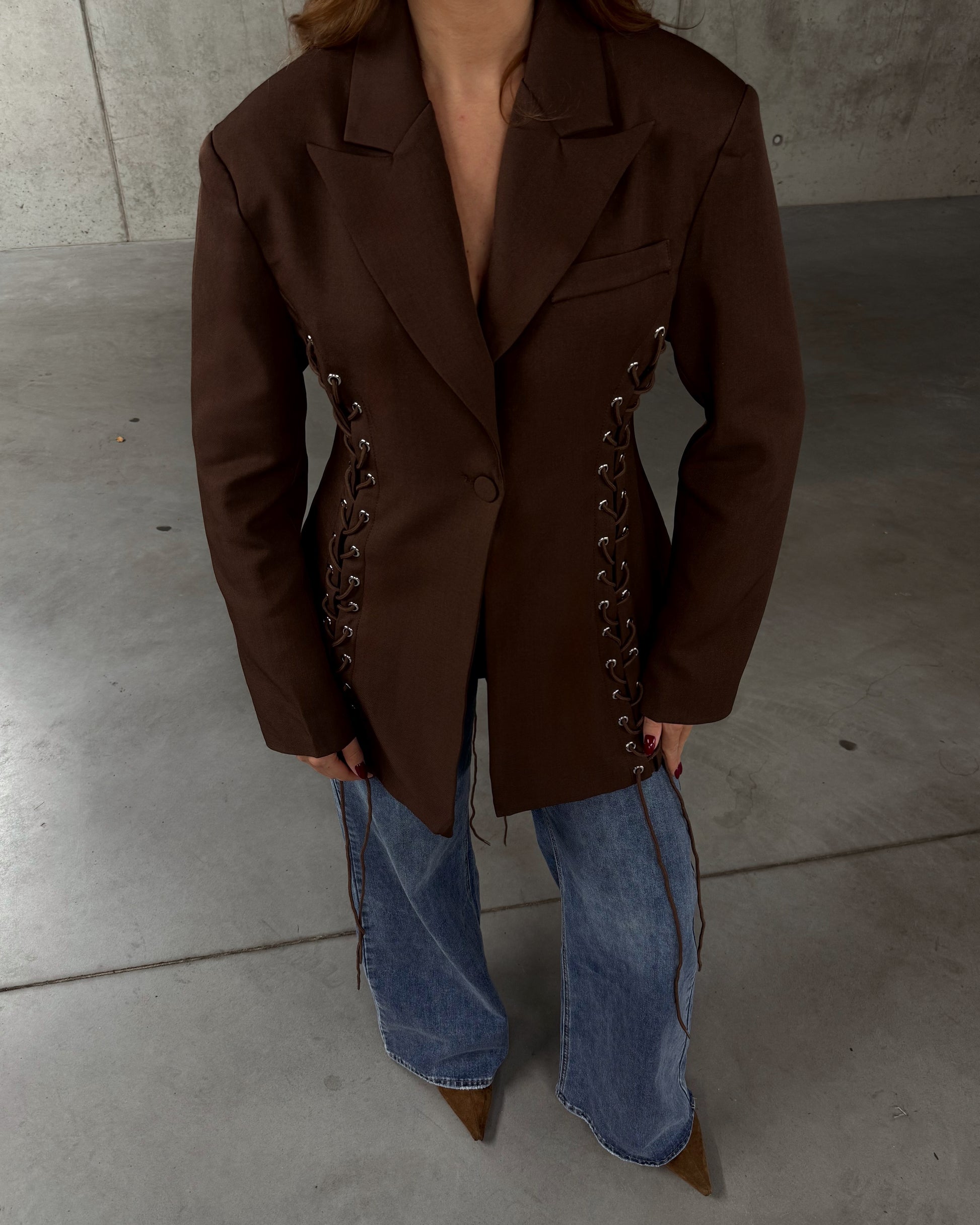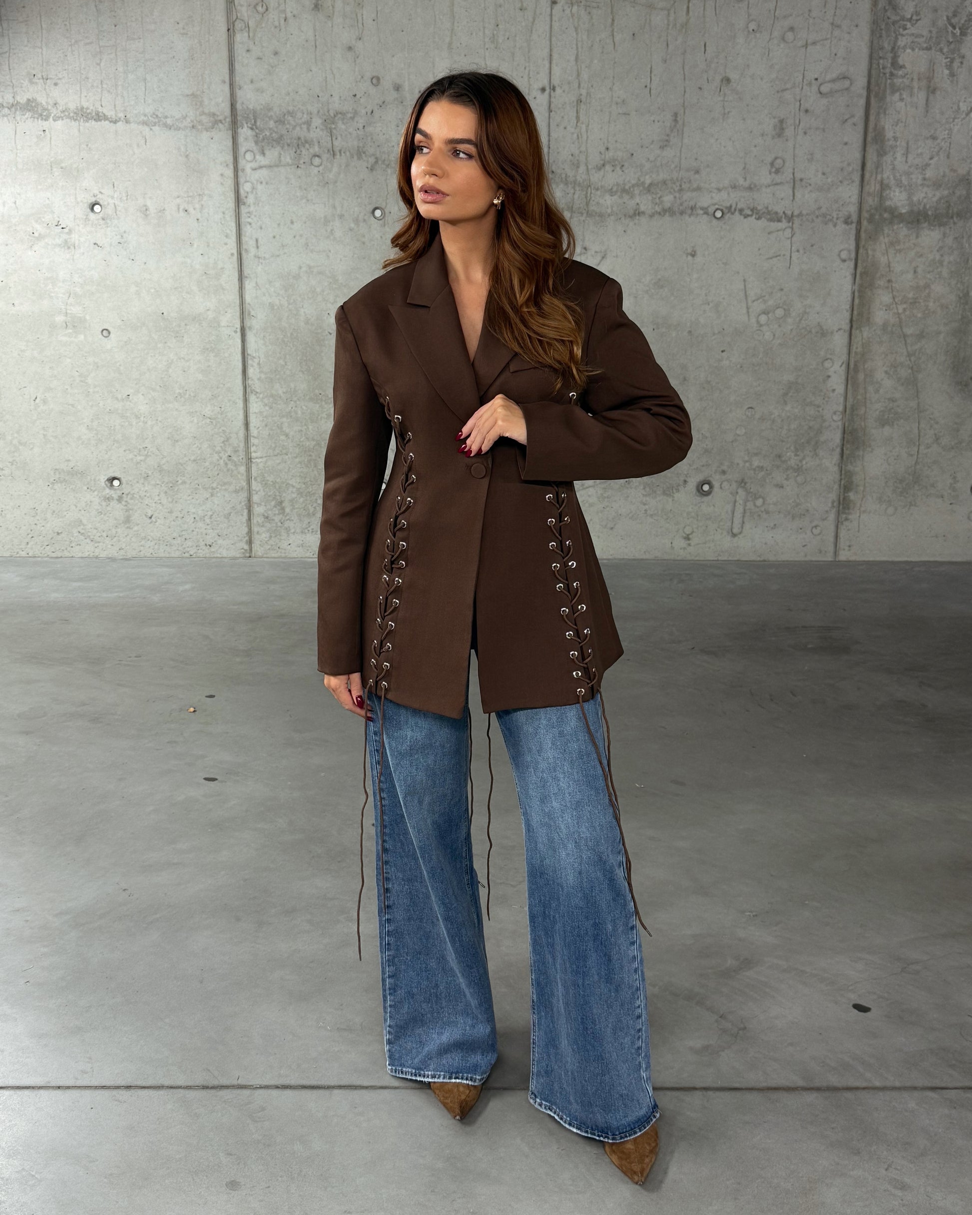 Išskirtinio modelio įliemenuotas švarkas, kuris gražiai pabrėžia figūrą. Pagamintas iš aukštos kokybės, standžios medžiagos, atrodo itin prabangiai.