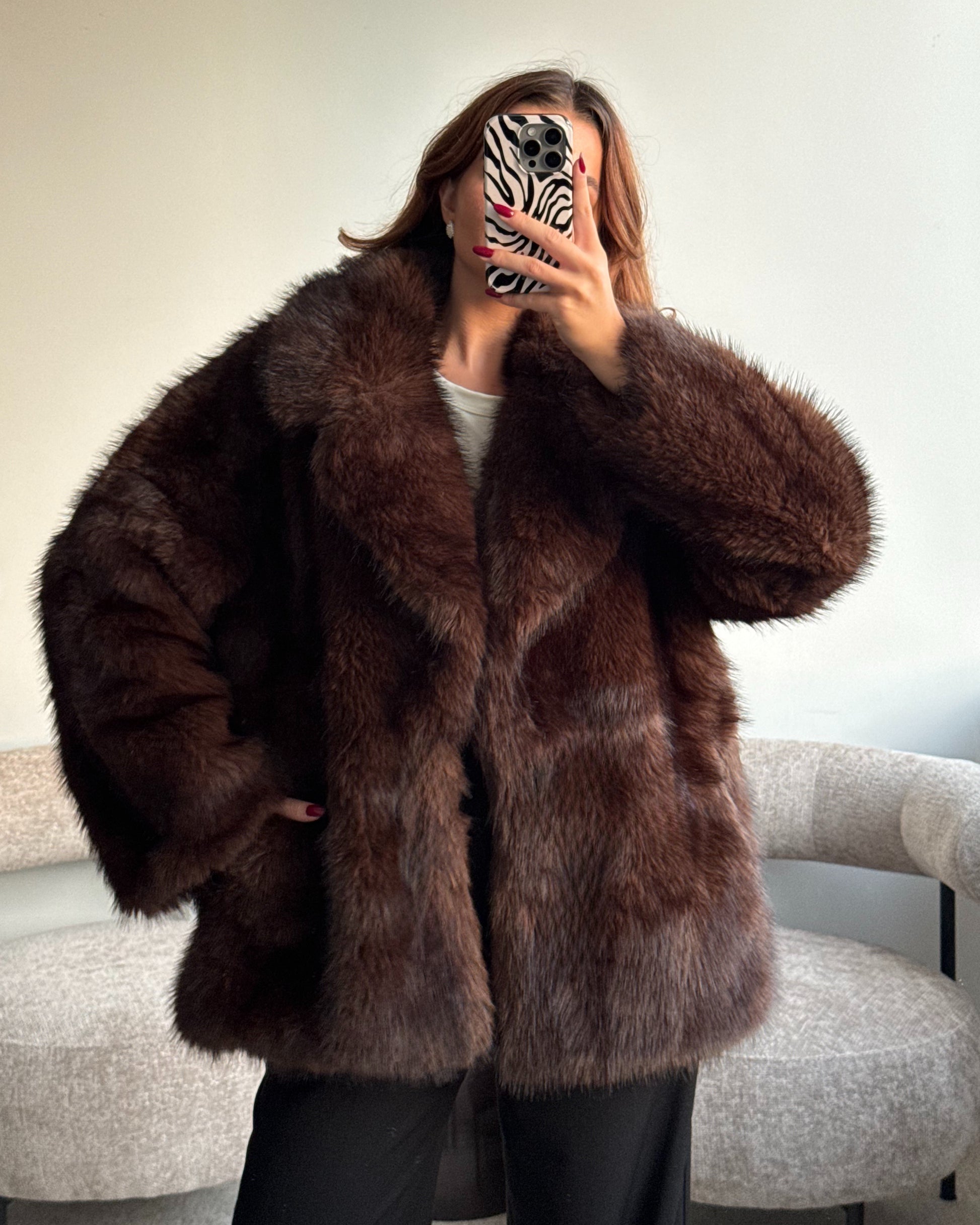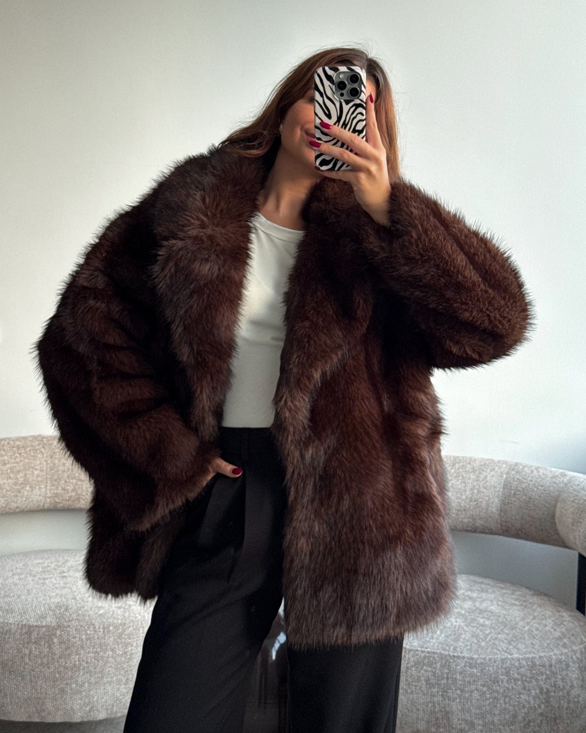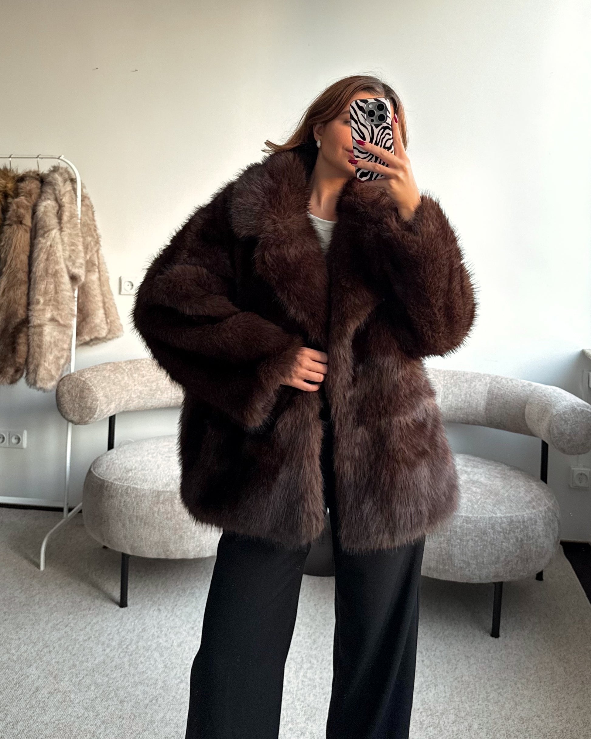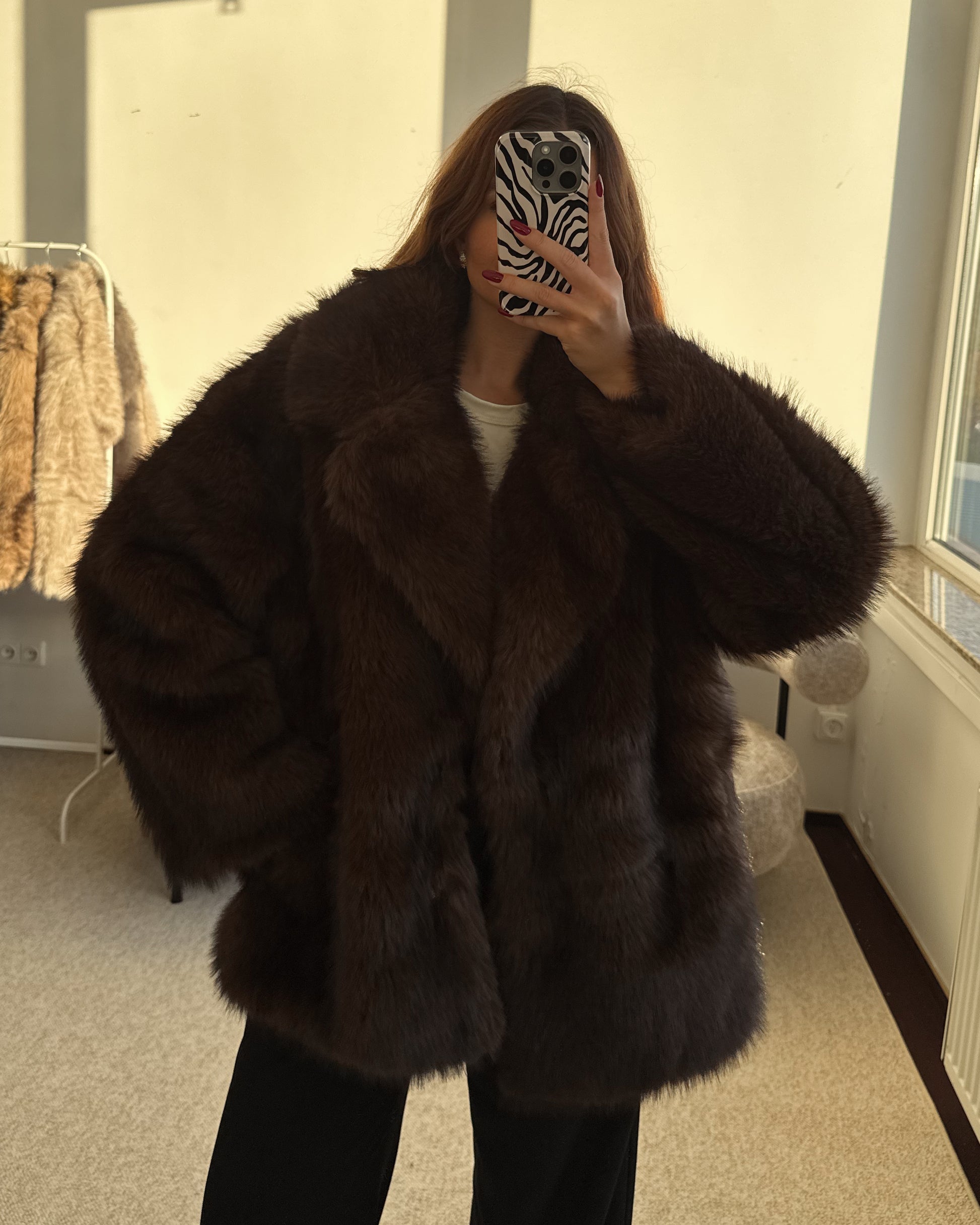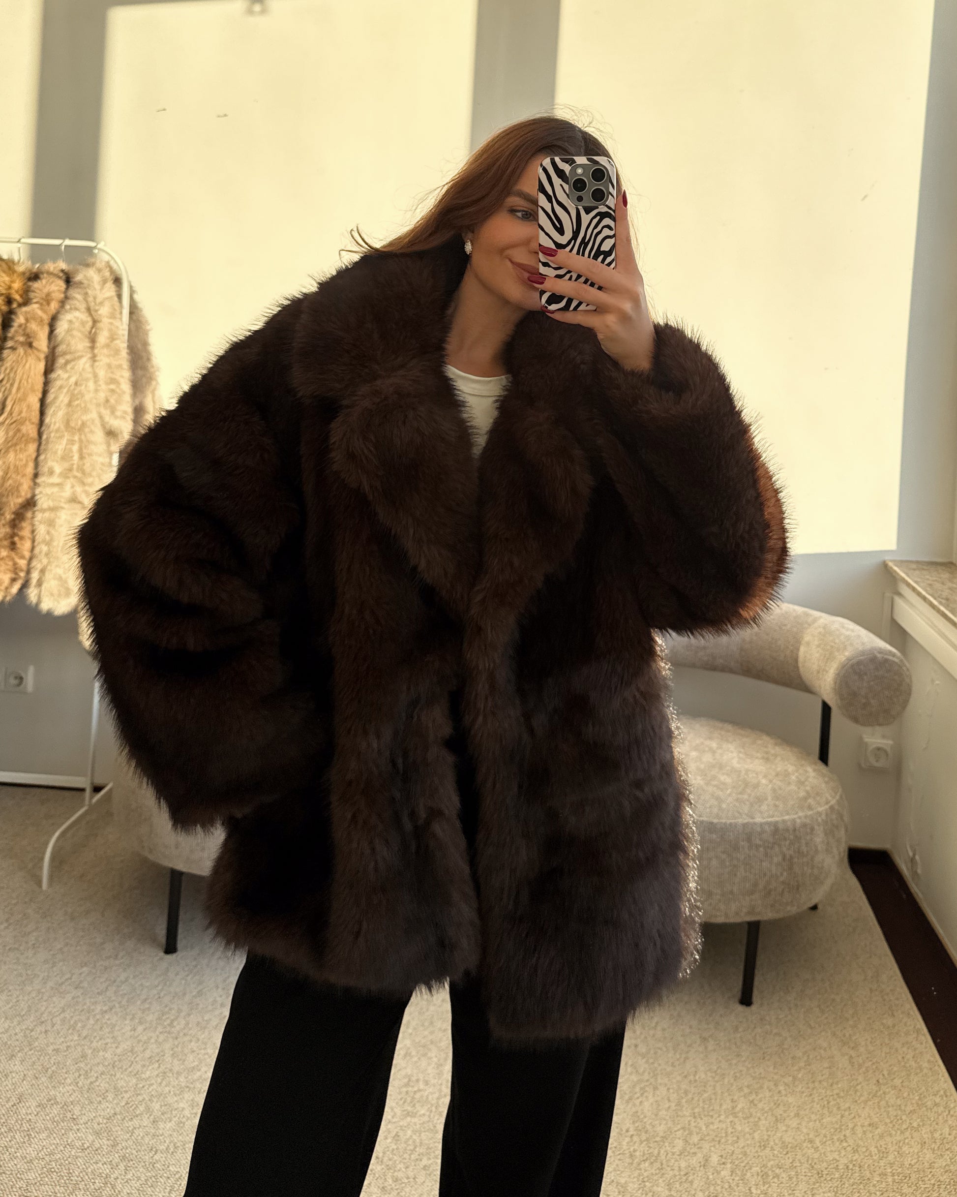 Švelnūs ir minkšti, labai prabangiai atrodantys kailinukai. Tamsiai rudos/šokoladinės spalvos, su pamušalu, kišenėmis, segasi metaliniais kabliukais. Tobulo ilgio - dengia klubus. Puikiai tiks tiek rudeniui, tiek žiemai. Modelis dėvi S/M dydį.