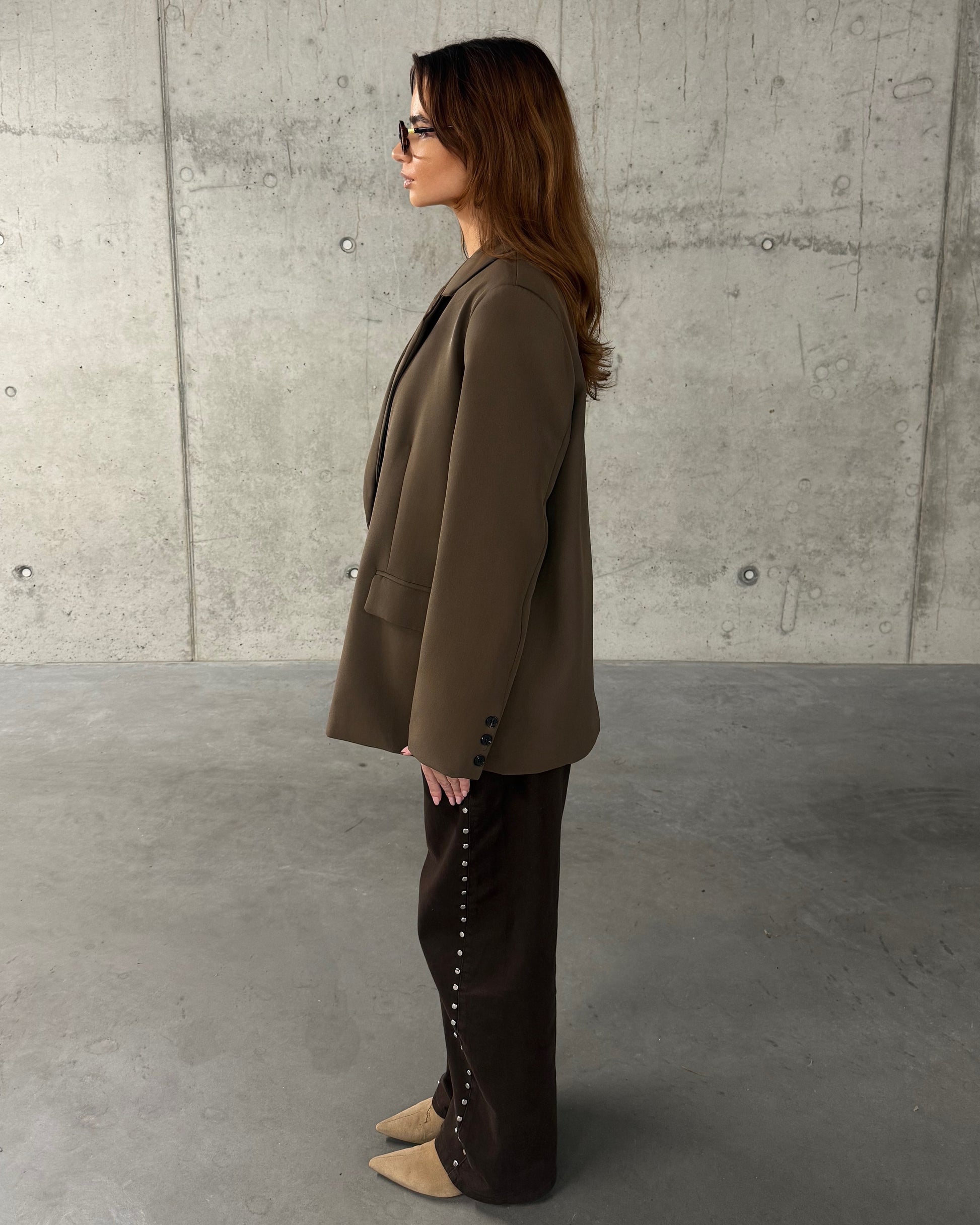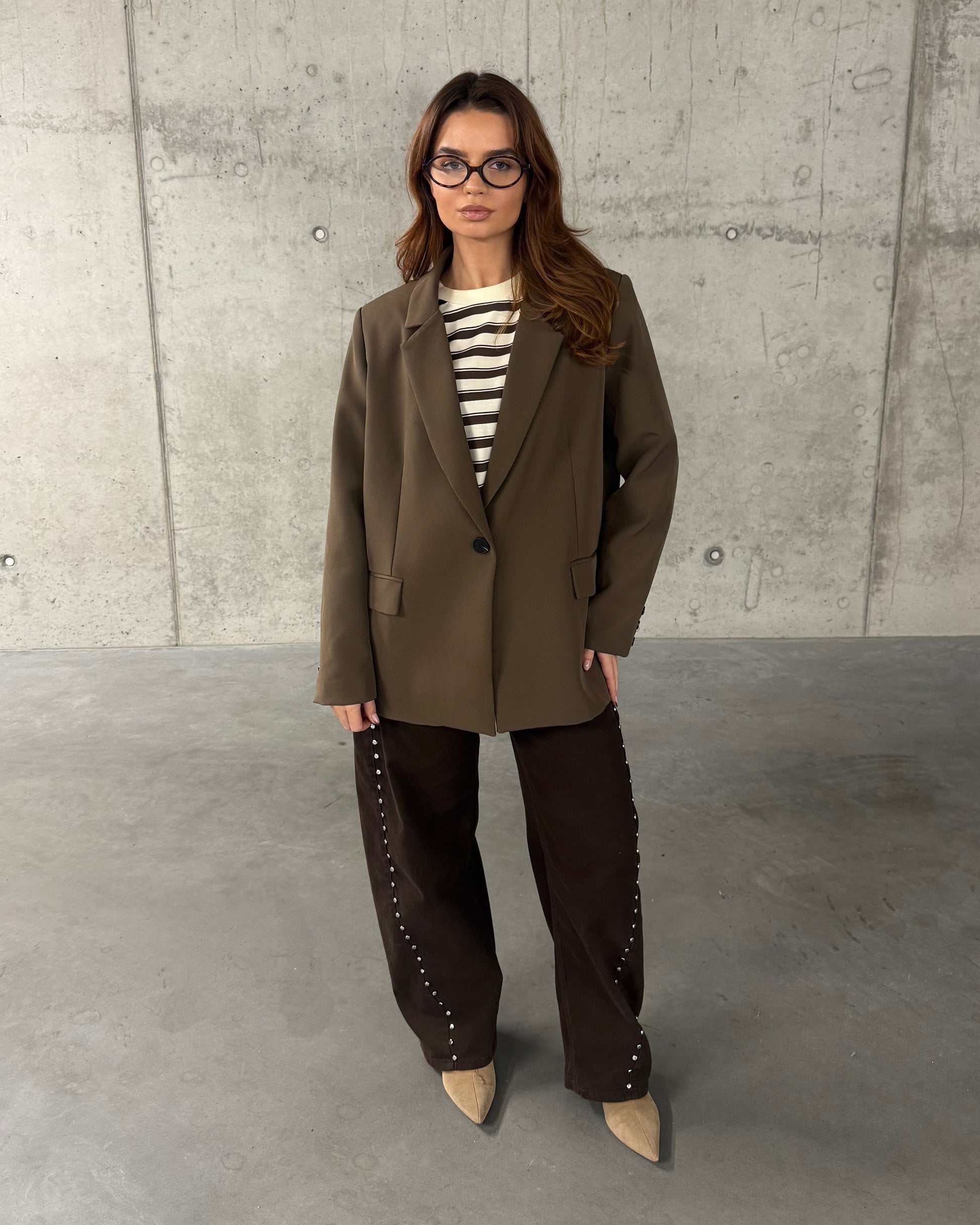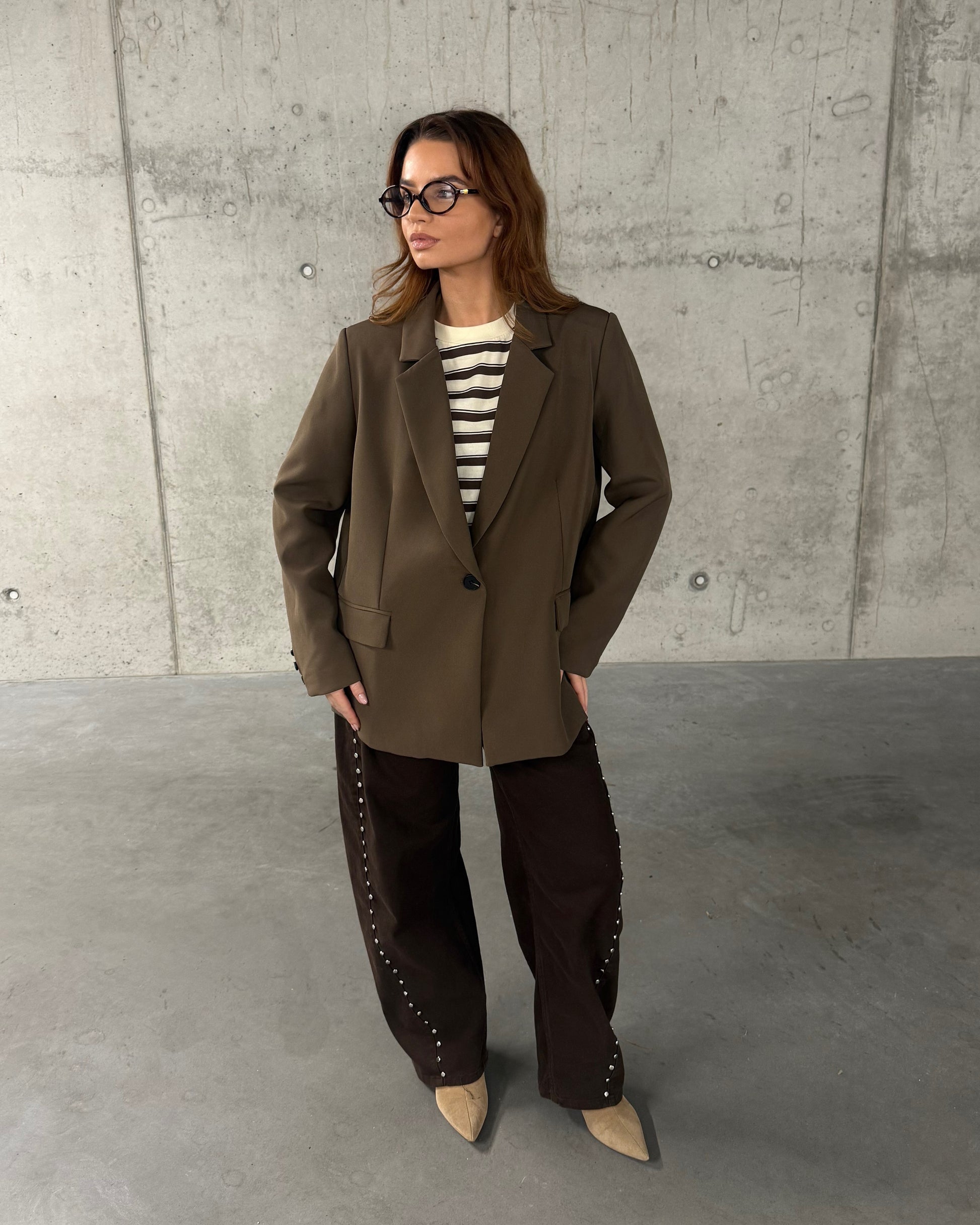 Stilingas, klasikinio kirpimo švarkas oversize siluetu - puikus pasirinkimas tiek kasdienai, tiek vakarui. Lengvai derinamas prie marškinėlių, megztinių ar suknelių. Kritimas tiesus, pečiai švelniai pakelti, medžiaga standesnė, todėl švarkas išlaiko formą ir atrodo prabangiai. Modelis dėvi S dydį.