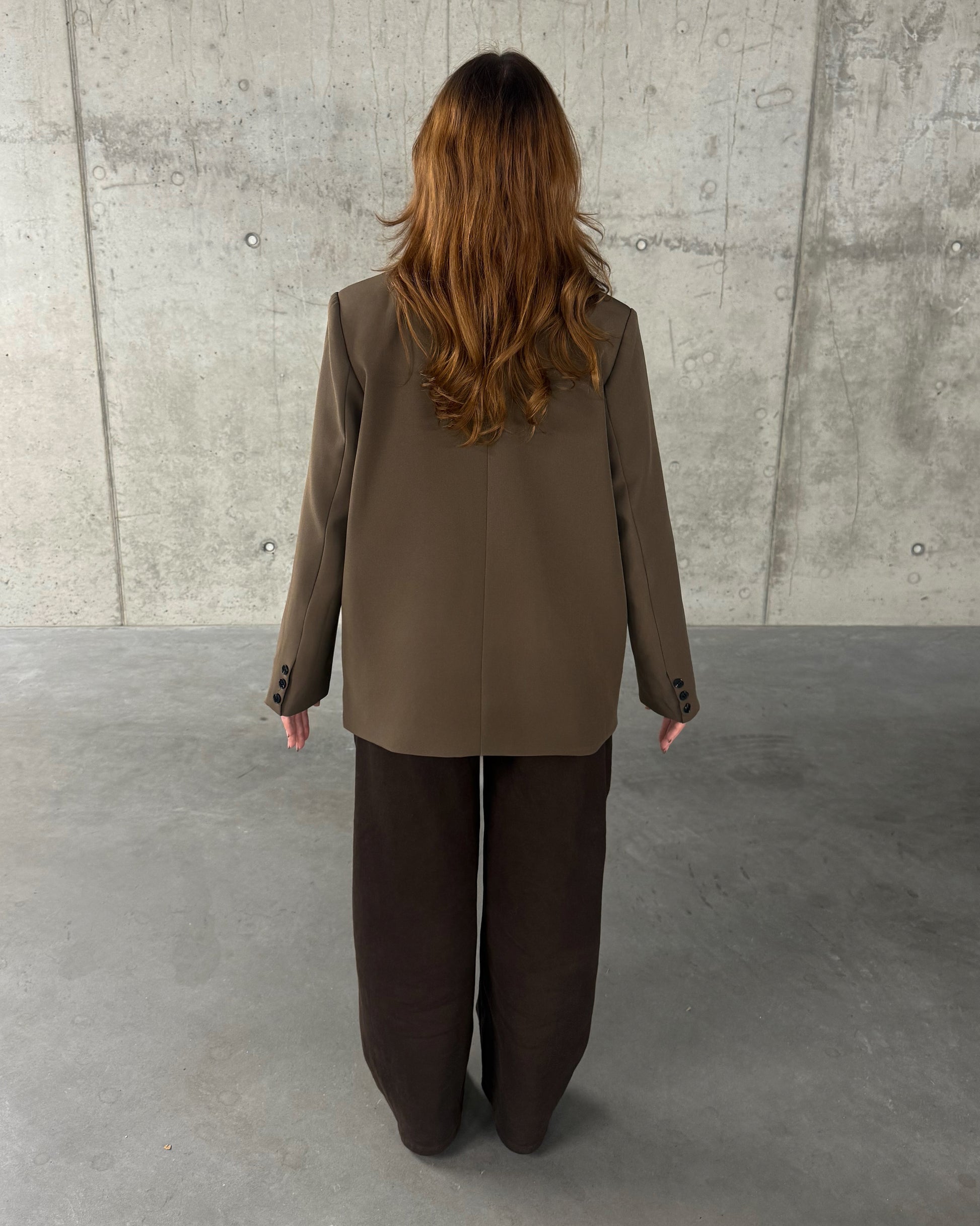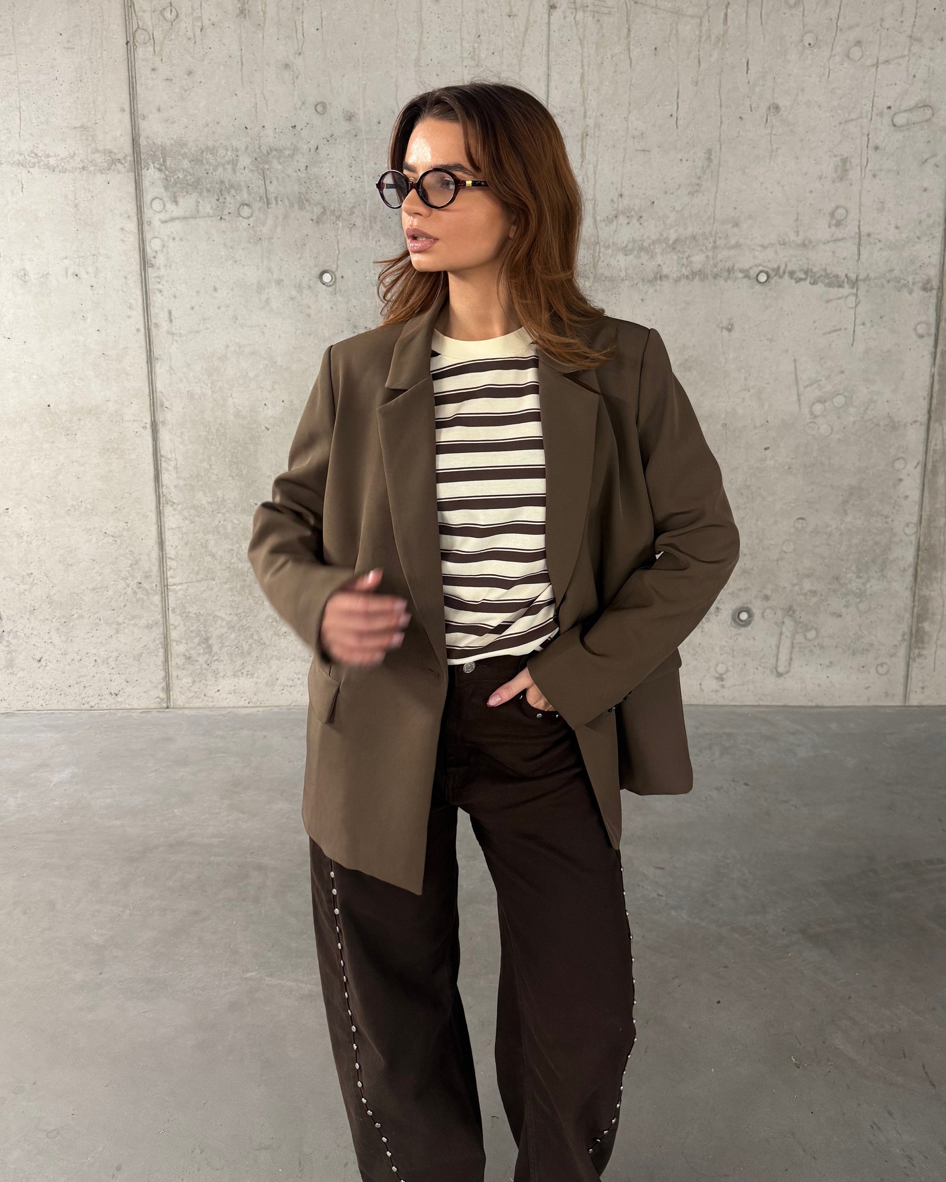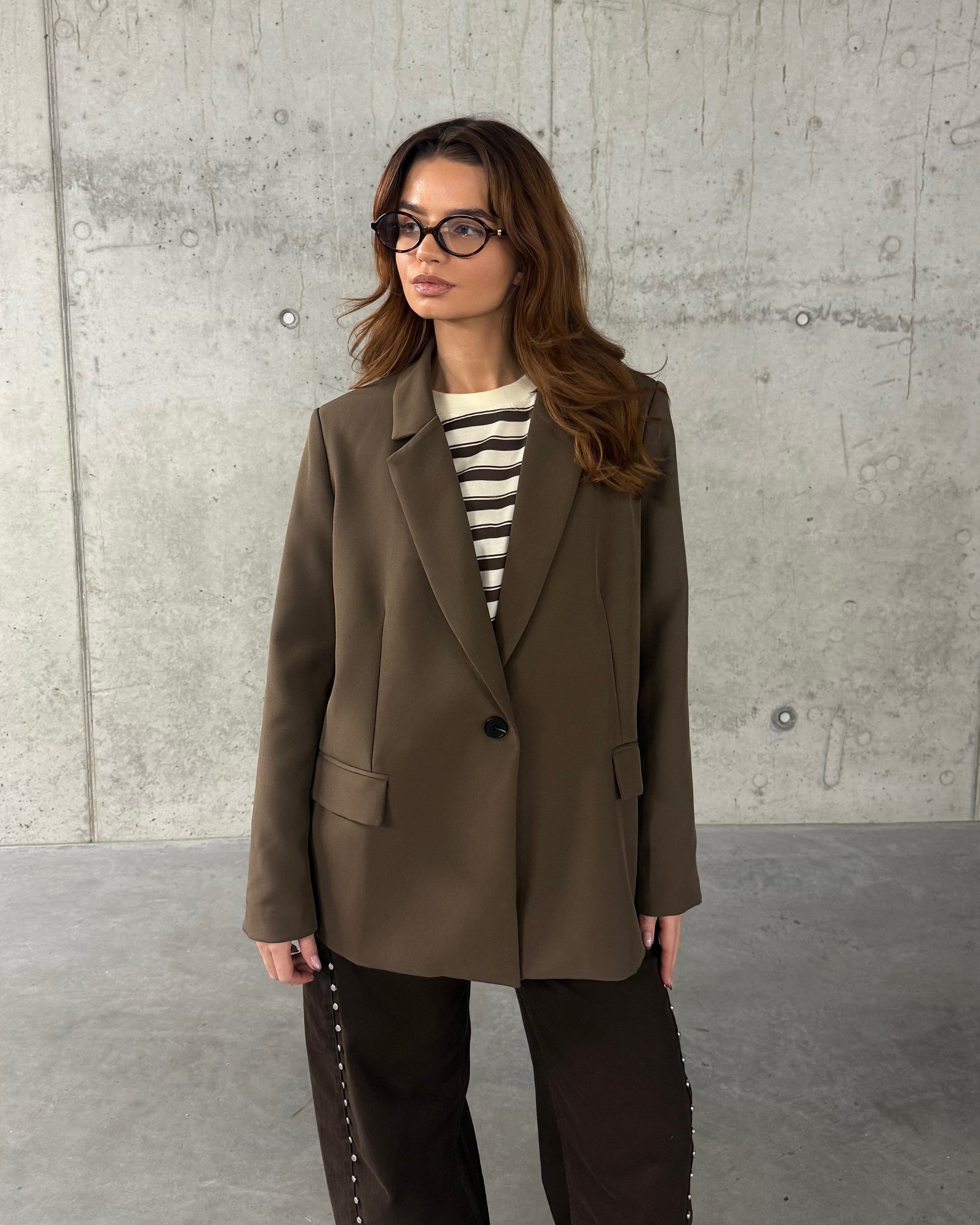 Stilingas, klasikinio kirpimo švarkas oversize siluetu - puikus pasirinkimas tiek kasdienai, tiek vakarui. Lengvai derinamas prie marškinėlių, megztinių ar suknelių. Kritimas tiesus, pečiai švelniai pakelti, medžiaga standesnė, todėl švarkas išlaiko formą ir atrodo prabangiai. Modelis dėvi S dydį.