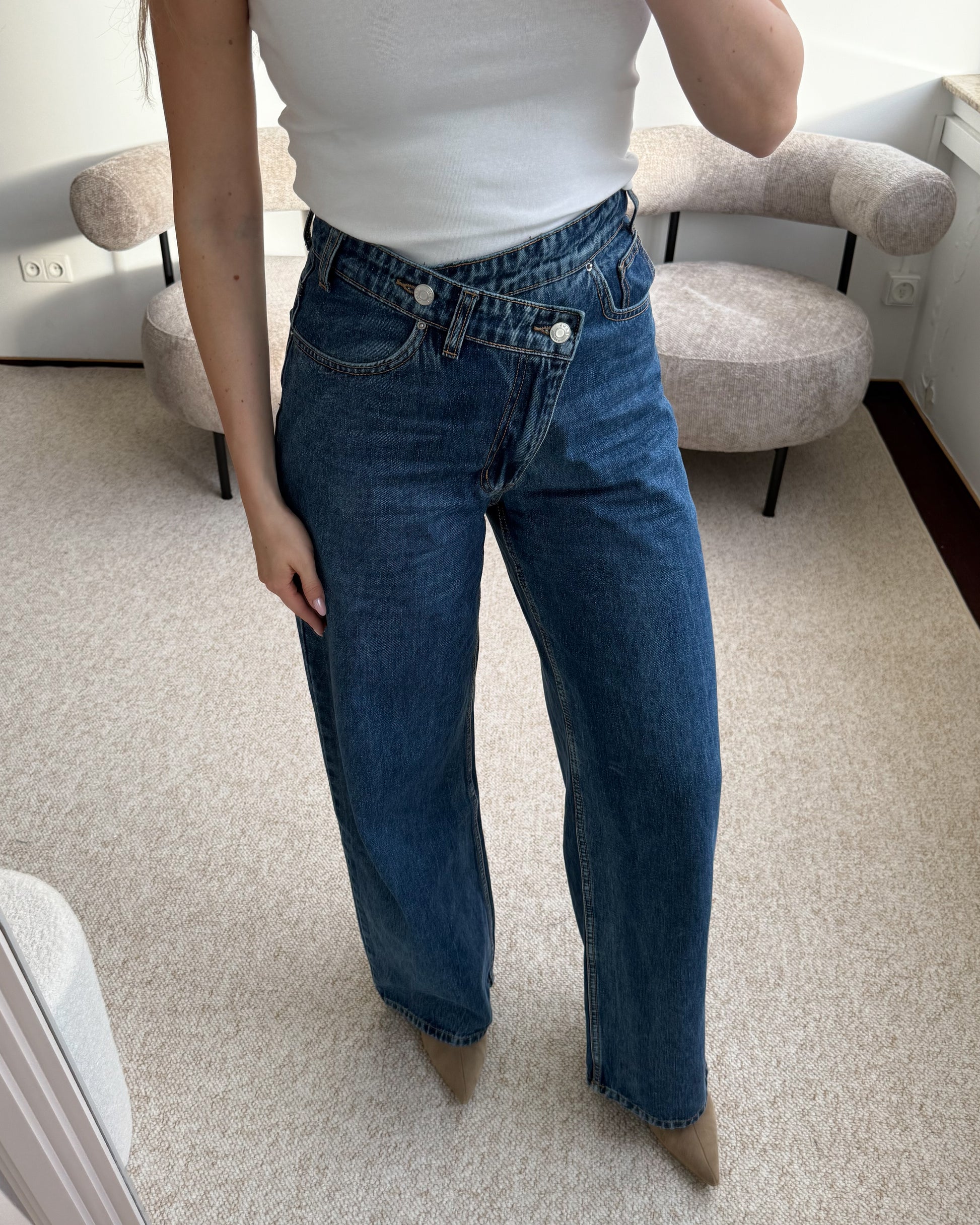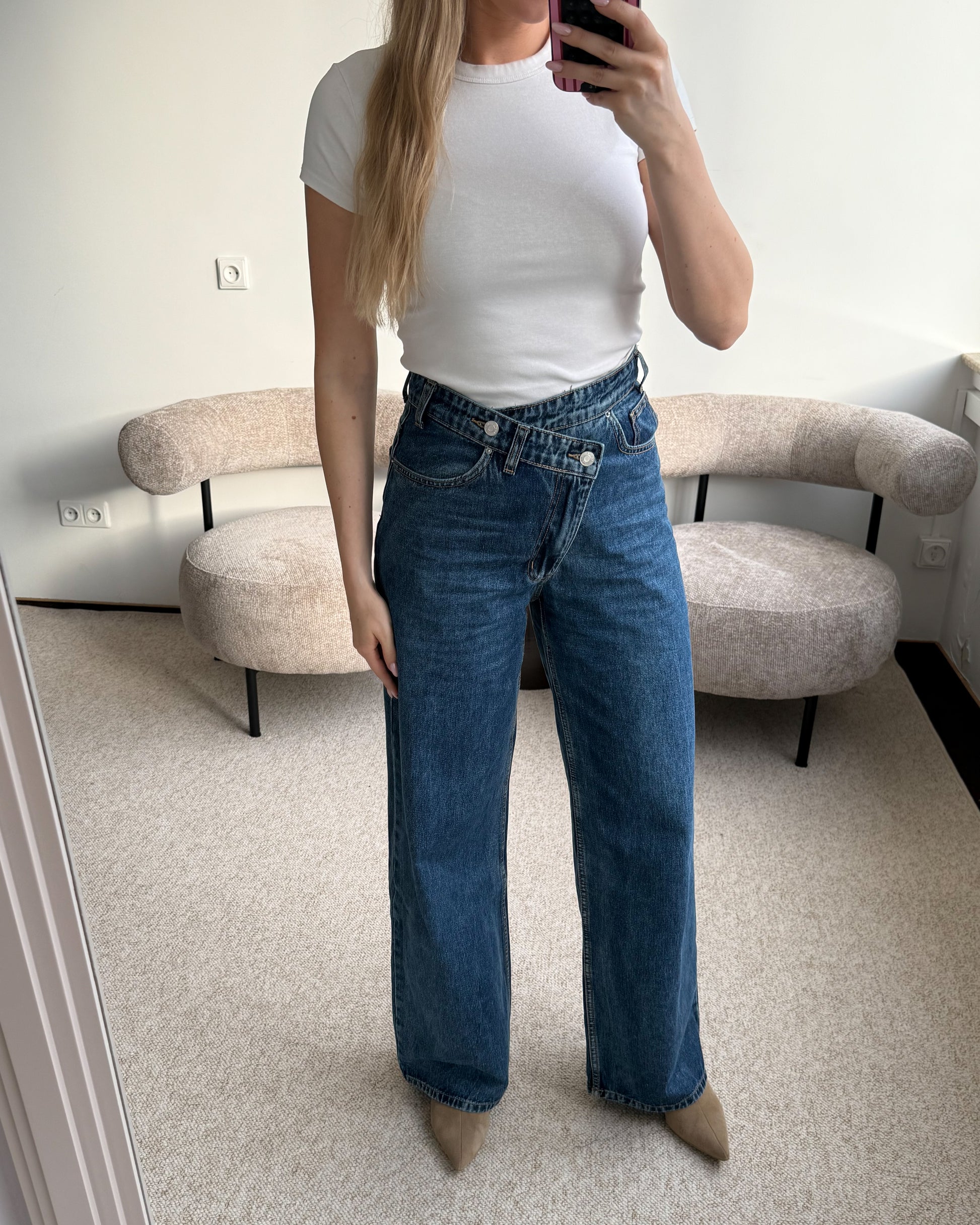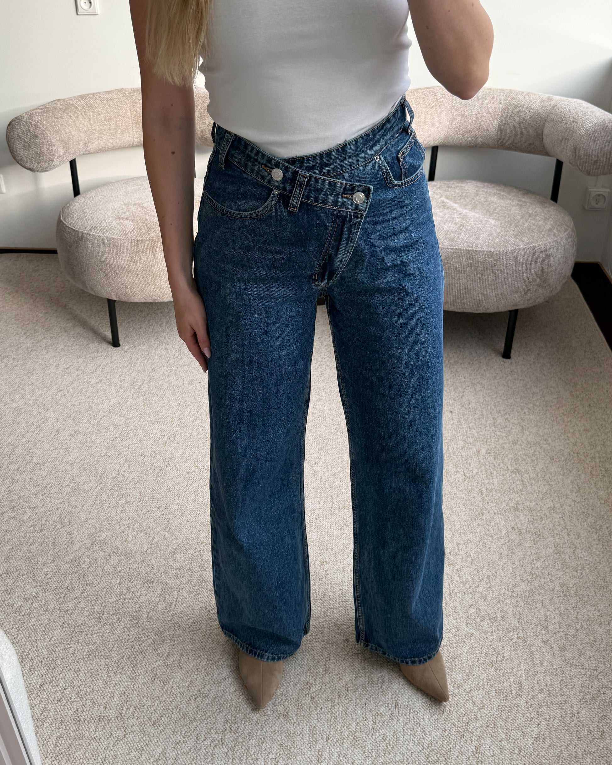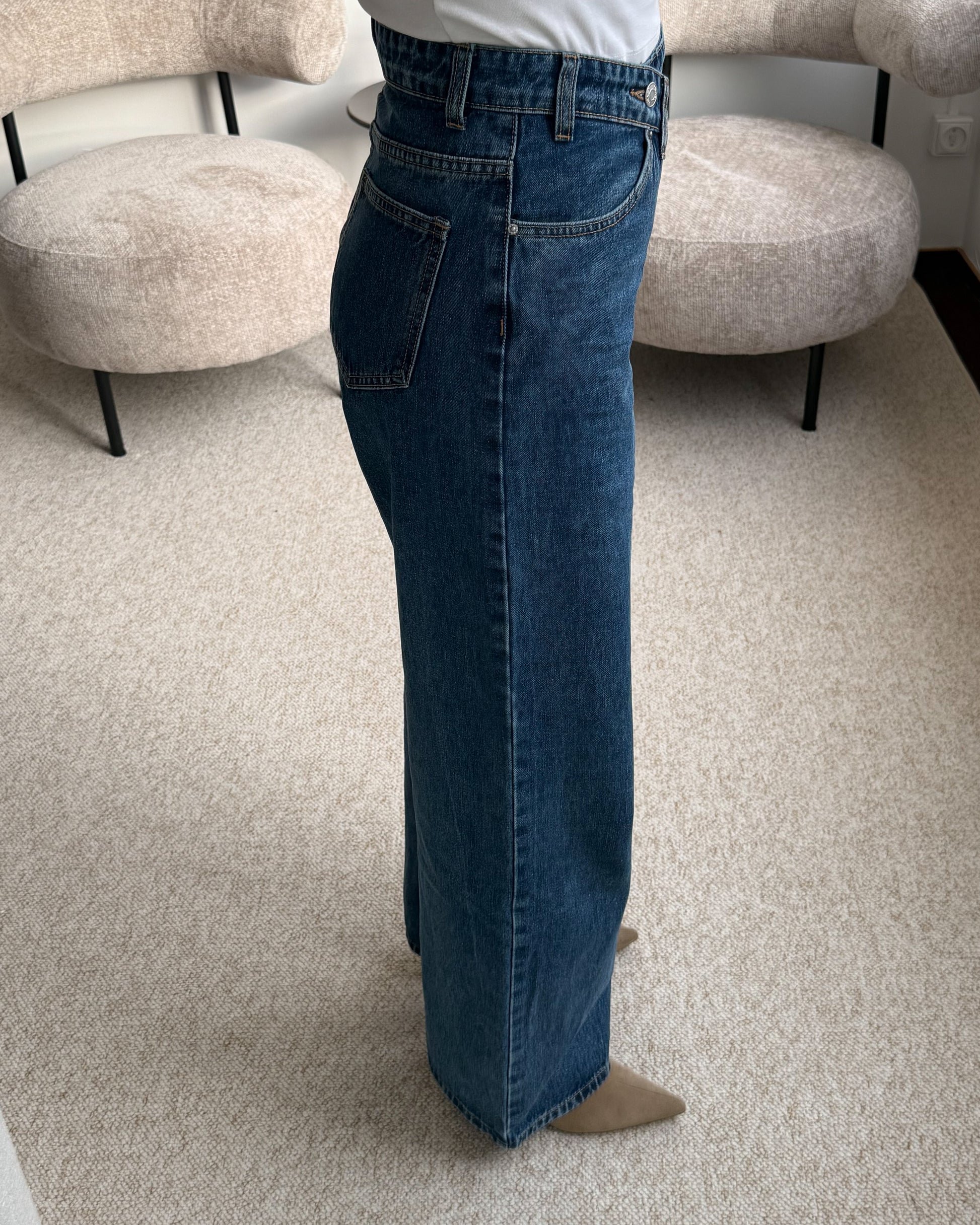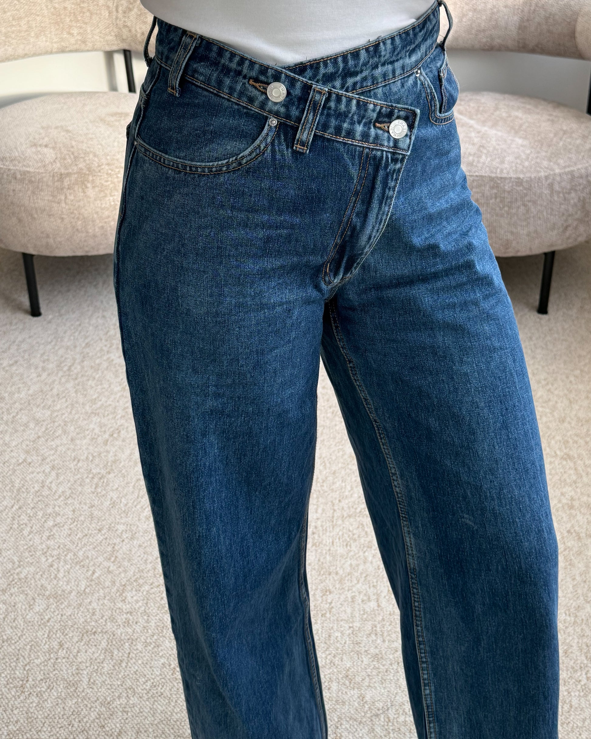 Plataus silueto džinsai, pasiūti iš standaus, aukštos kokybės džinso. Modelis pasižymi aukštu liemeniu, asimetrišku užsegimu ir tiesiomis, plačiomis klešnėmis, kurios optiškai ilgina kojas. Audinys išlaiko formą, todėl džinsai atrodo struktūruotai ir stilingai tiek prie marškinių, tiek prie megztinių.