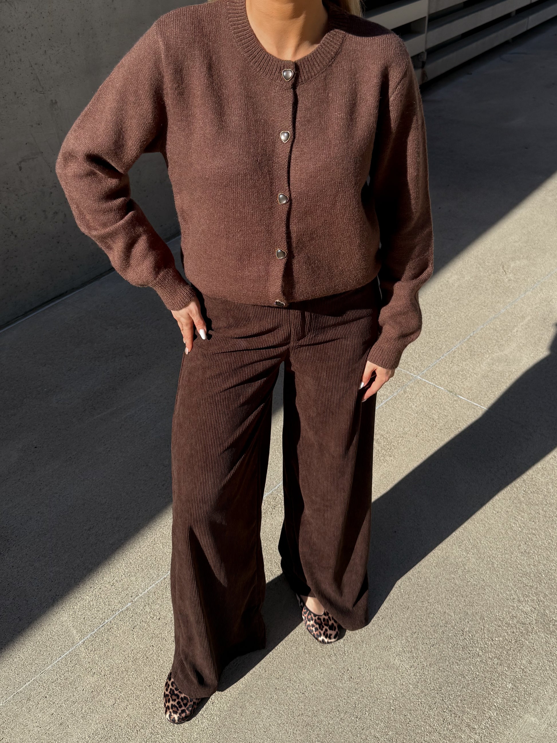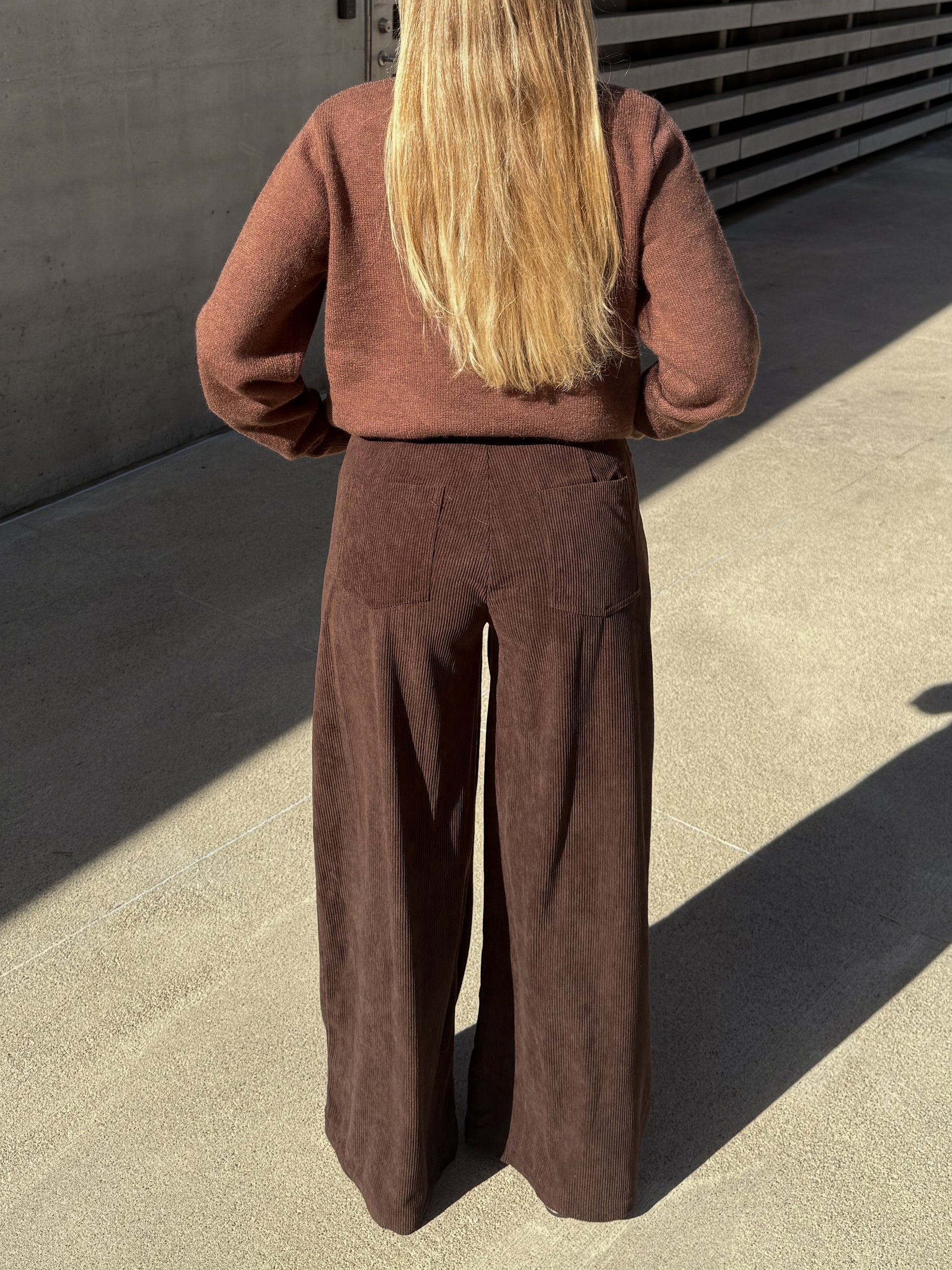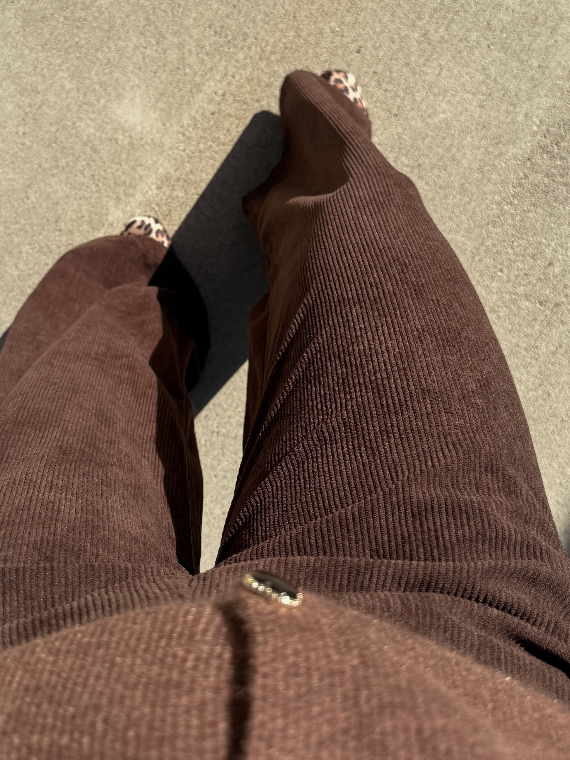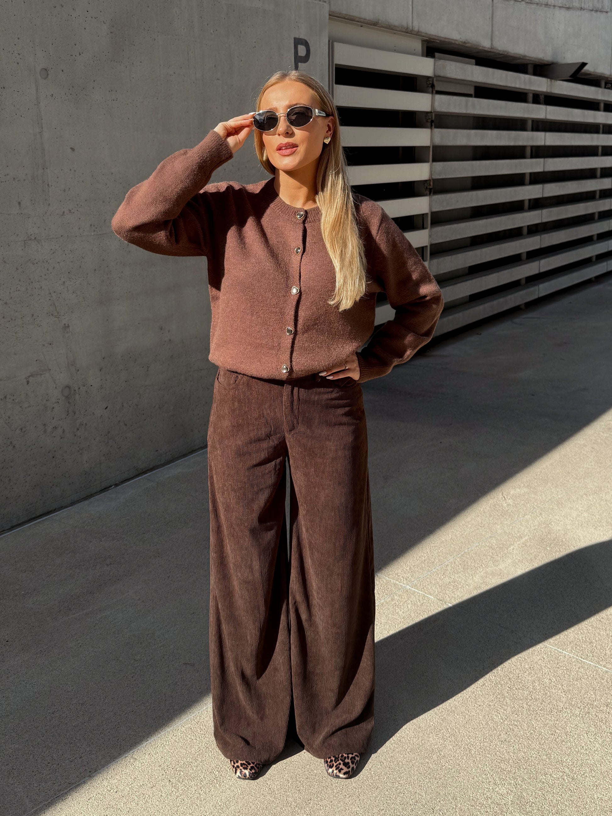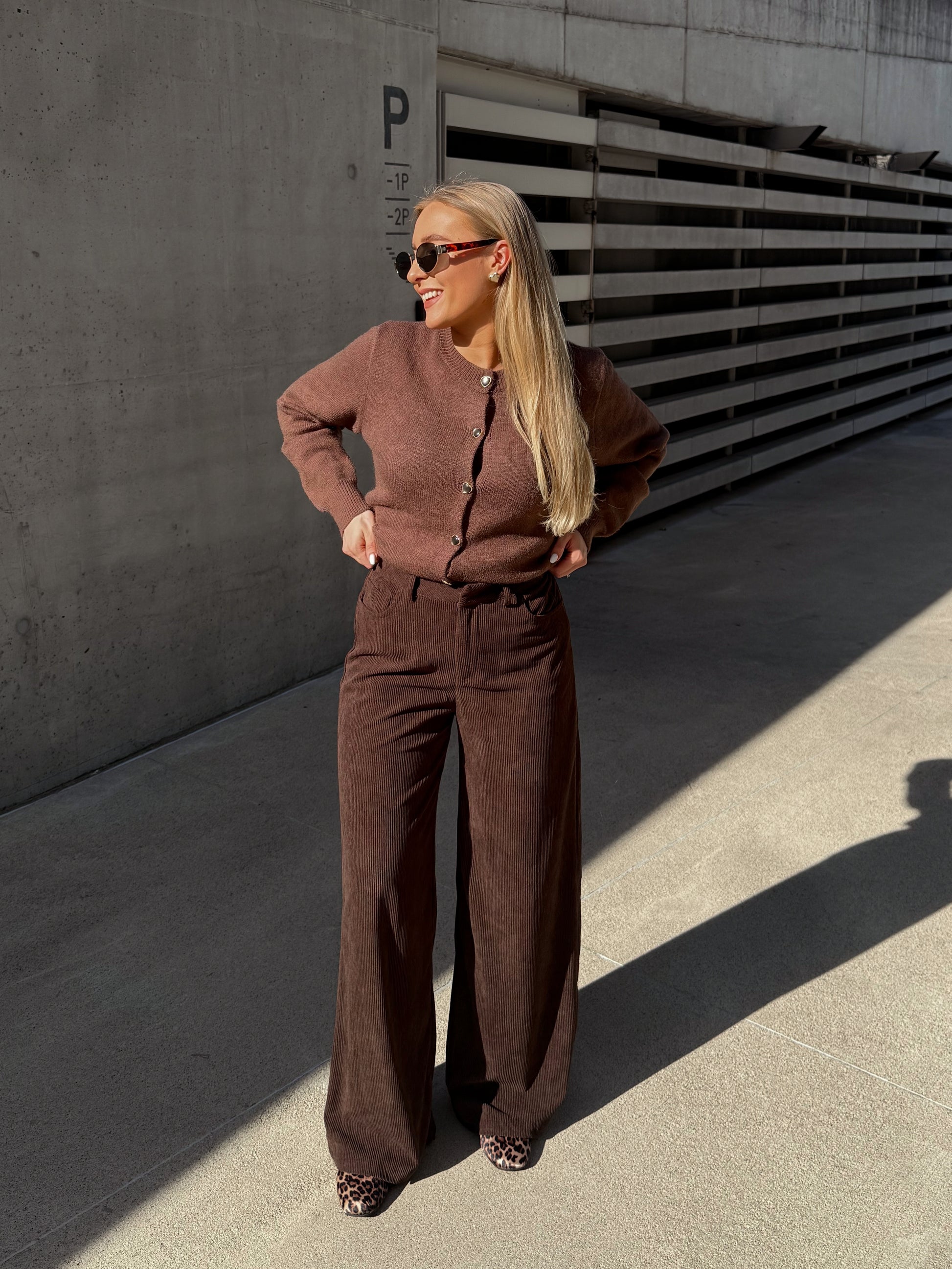 Klasikinio kirpimo, platėjančios velvetinės kelnės. Maloni, minkšta tekstūra suteikia išskirtinį komfortą, o tamsiai ruda spalva lengvai derinama prie įvairių derinių.